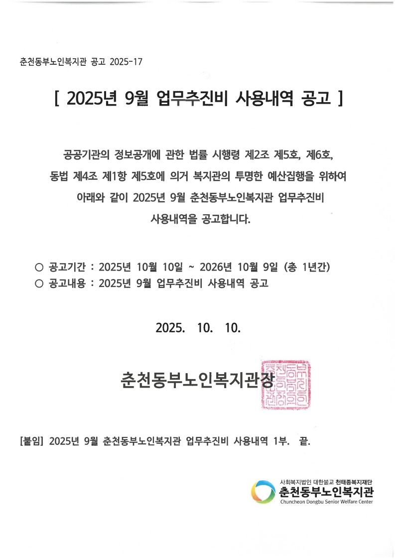 공지 [재정공고] 2025년 9월 업무추진비 사용내역 공고