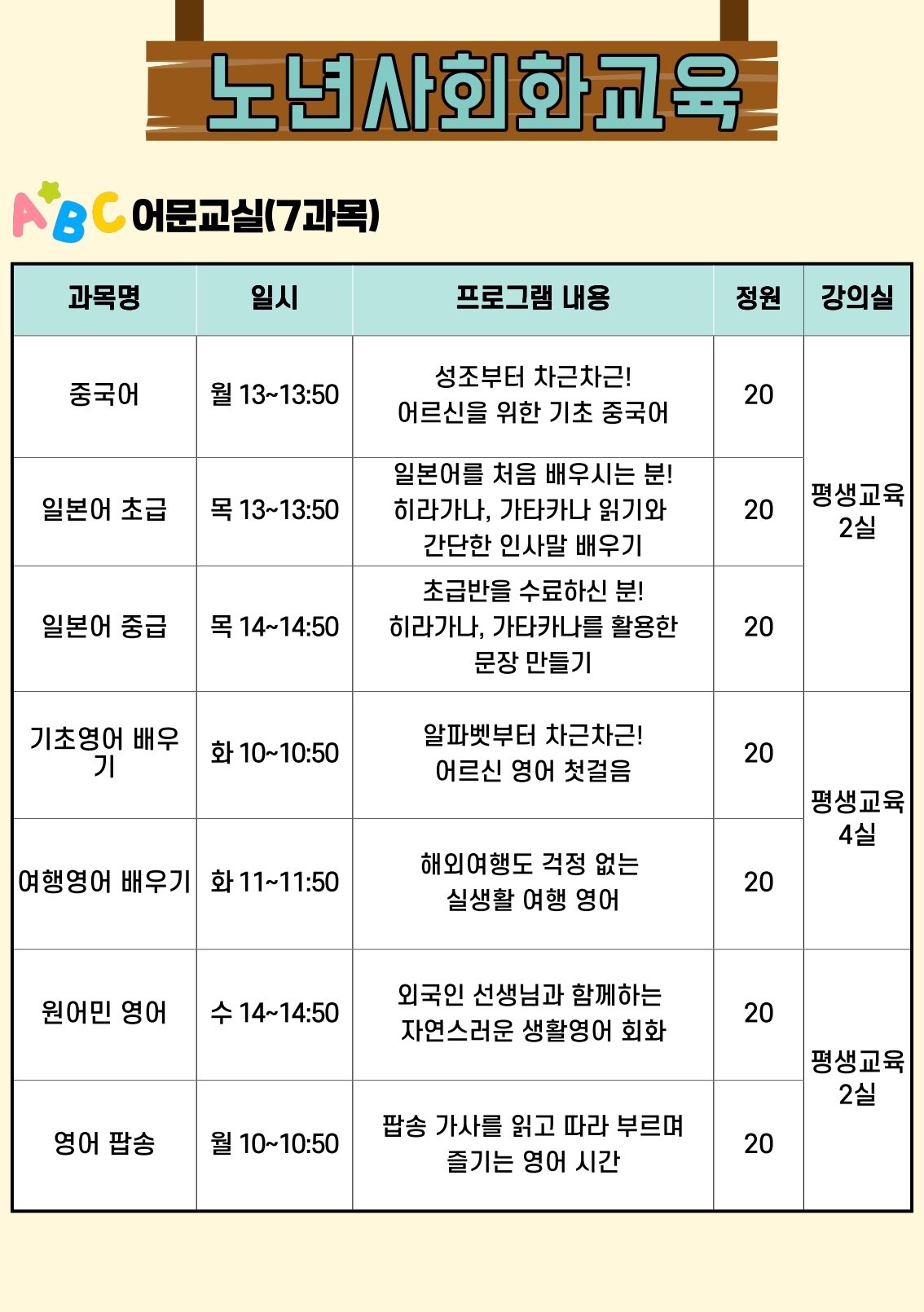 - 수업에 발생되는 교재 및 재료비는 어르신 개인 부담