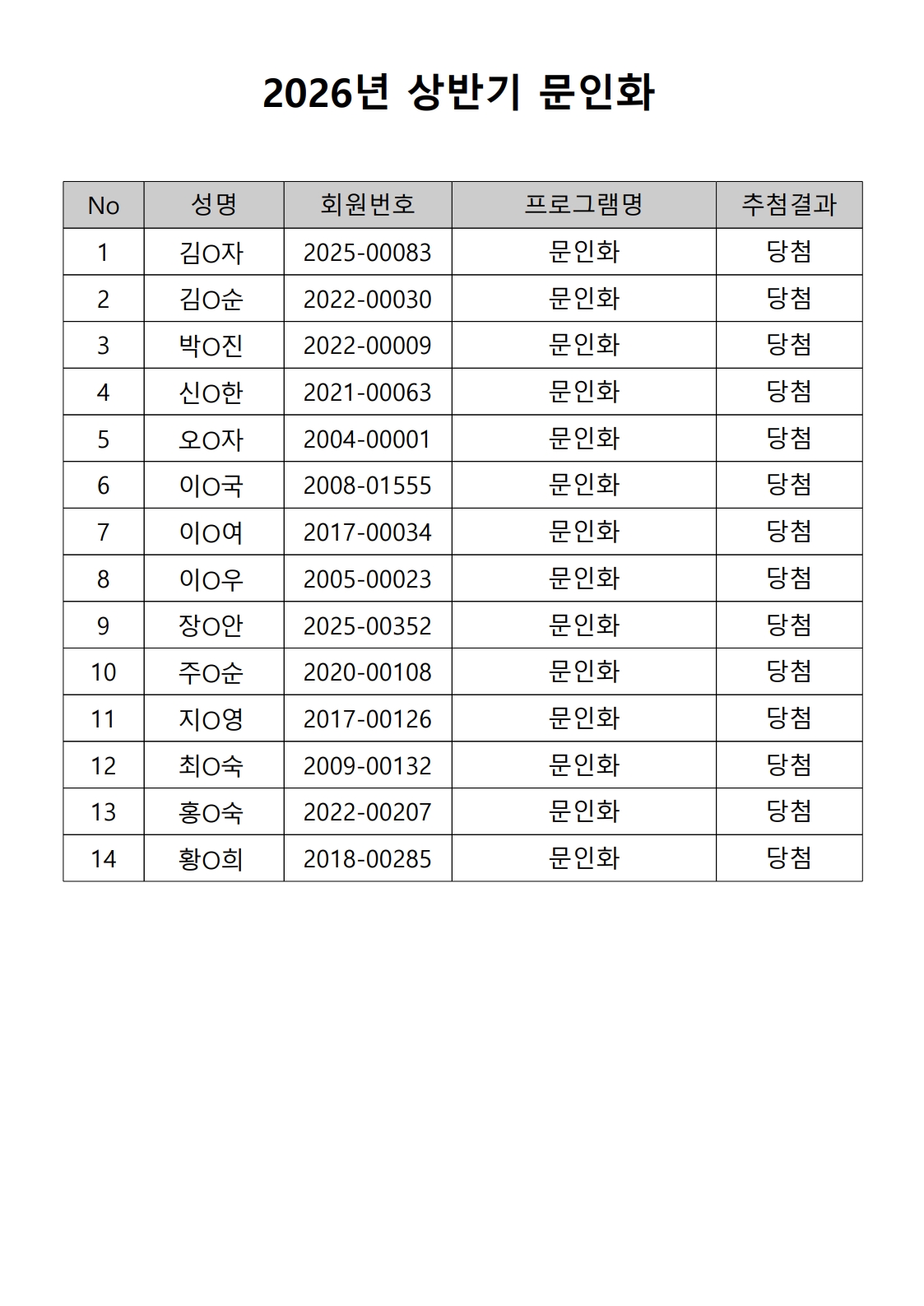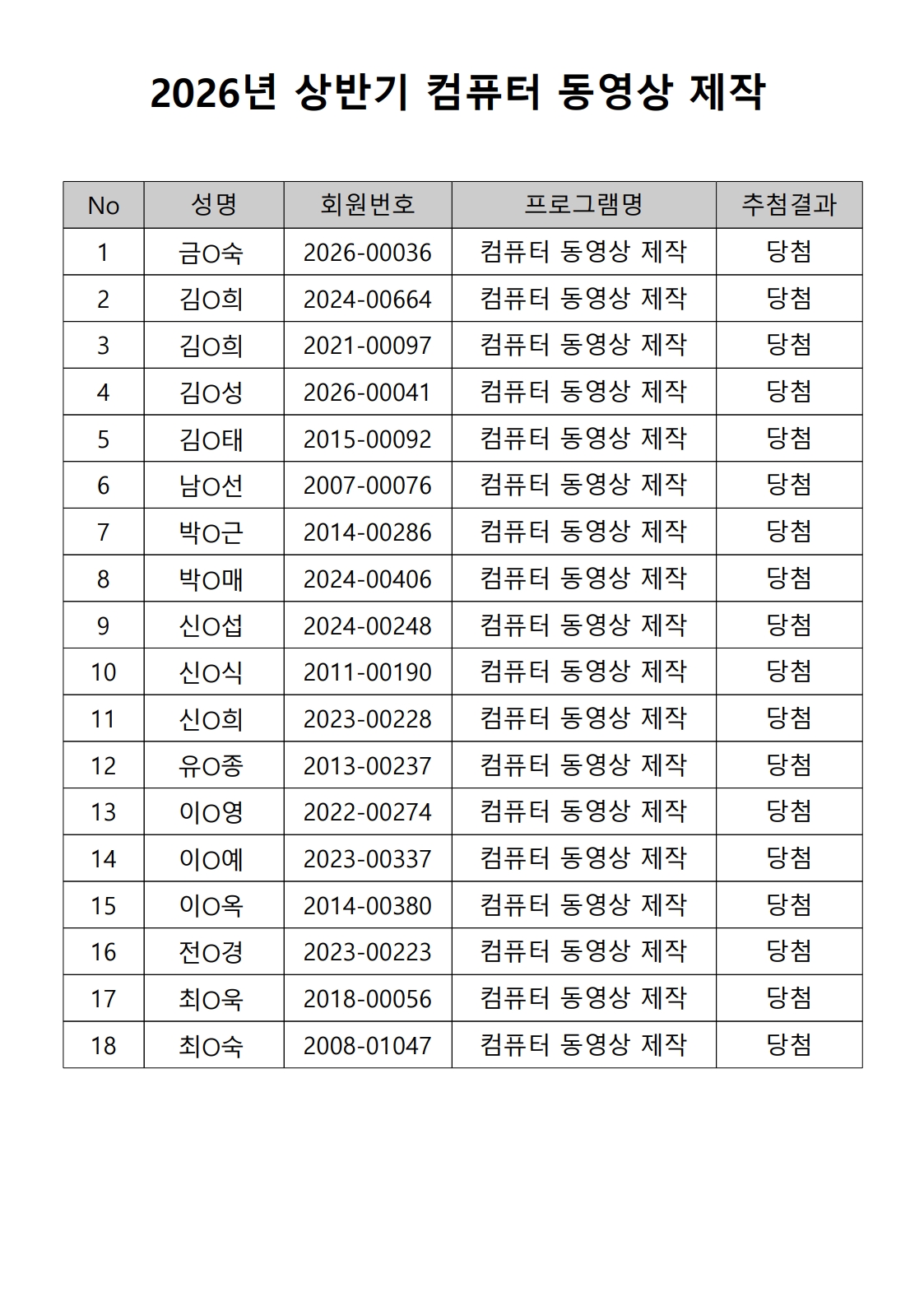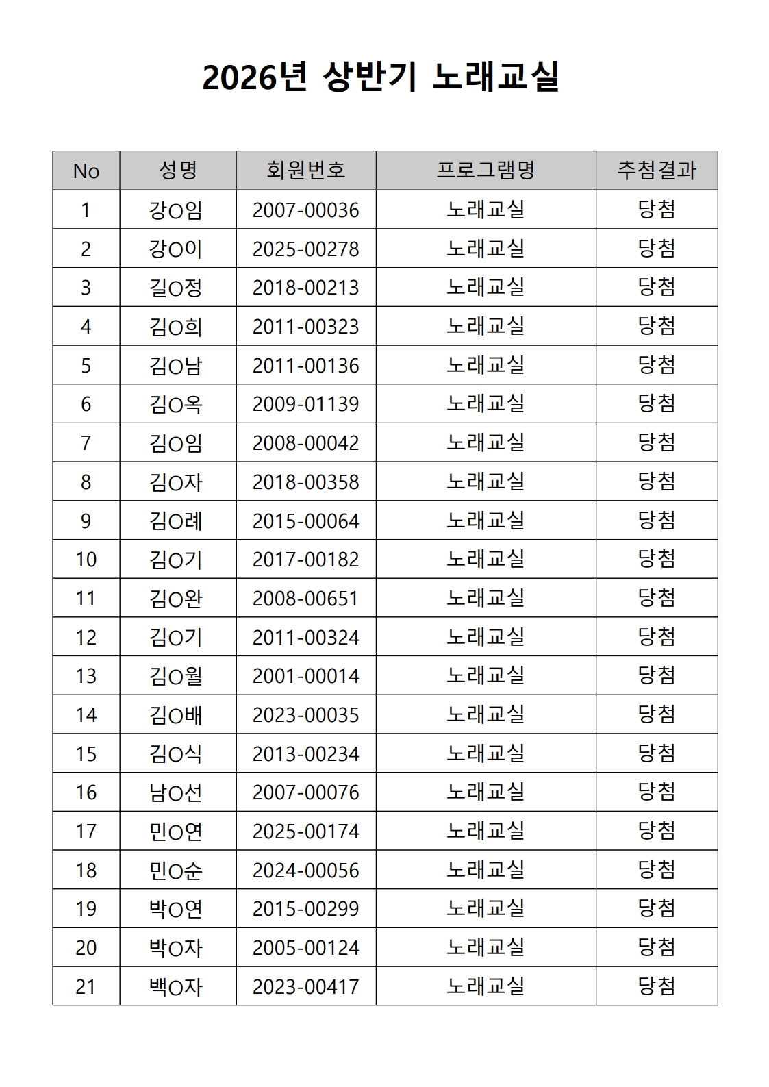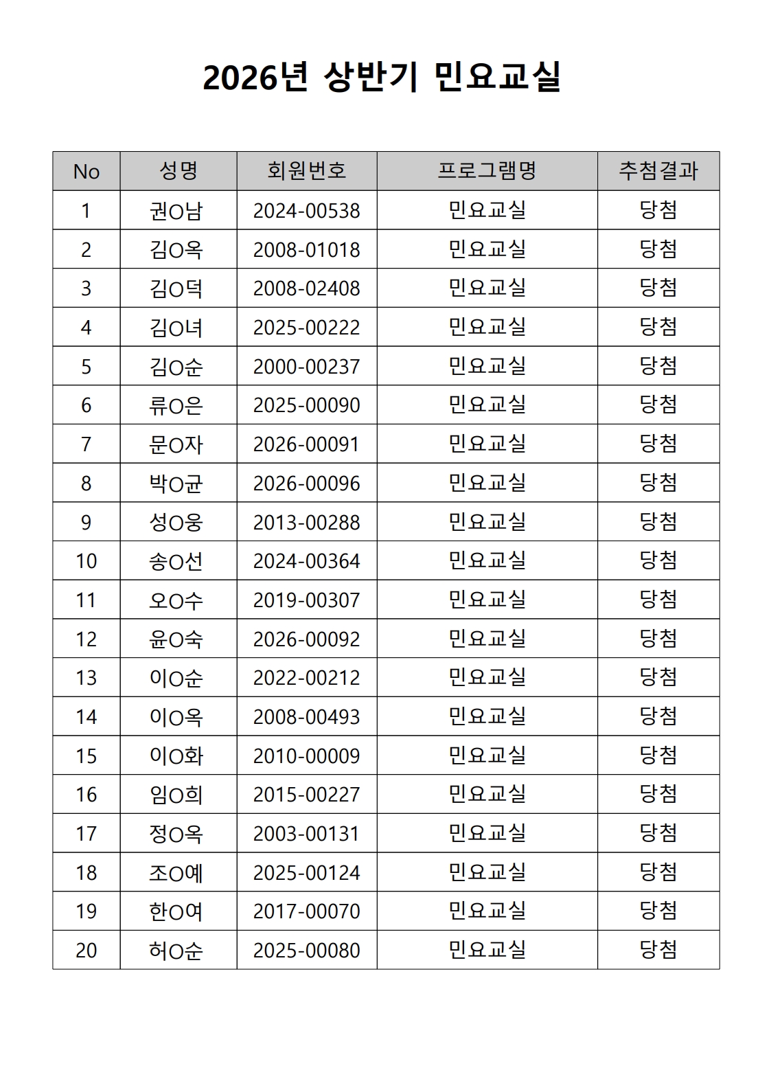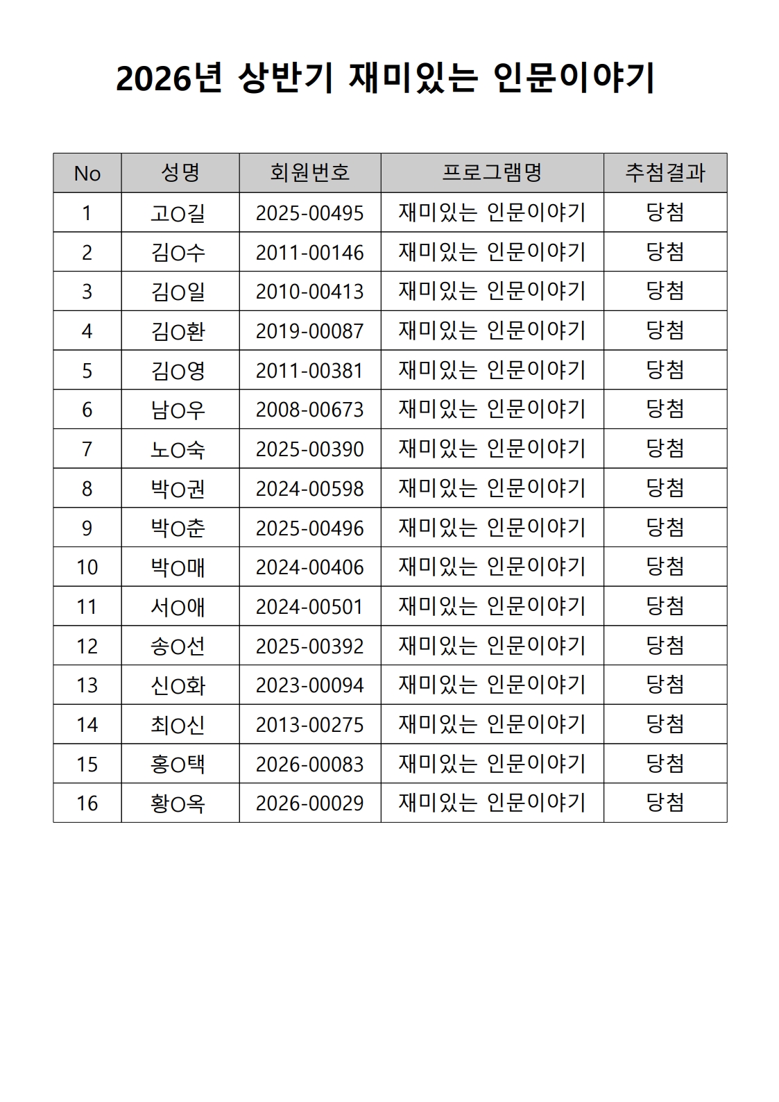 2026년 상반기 노년사회화 및 정보화교육프로그램 추첨이 2026.02.02.(월) 11:00에 진행되었으며, 이에 따라 아래와 같이 추첨 결과를 안내드립니다. (정원 초과 과목에 대한 추첨만 진행)
