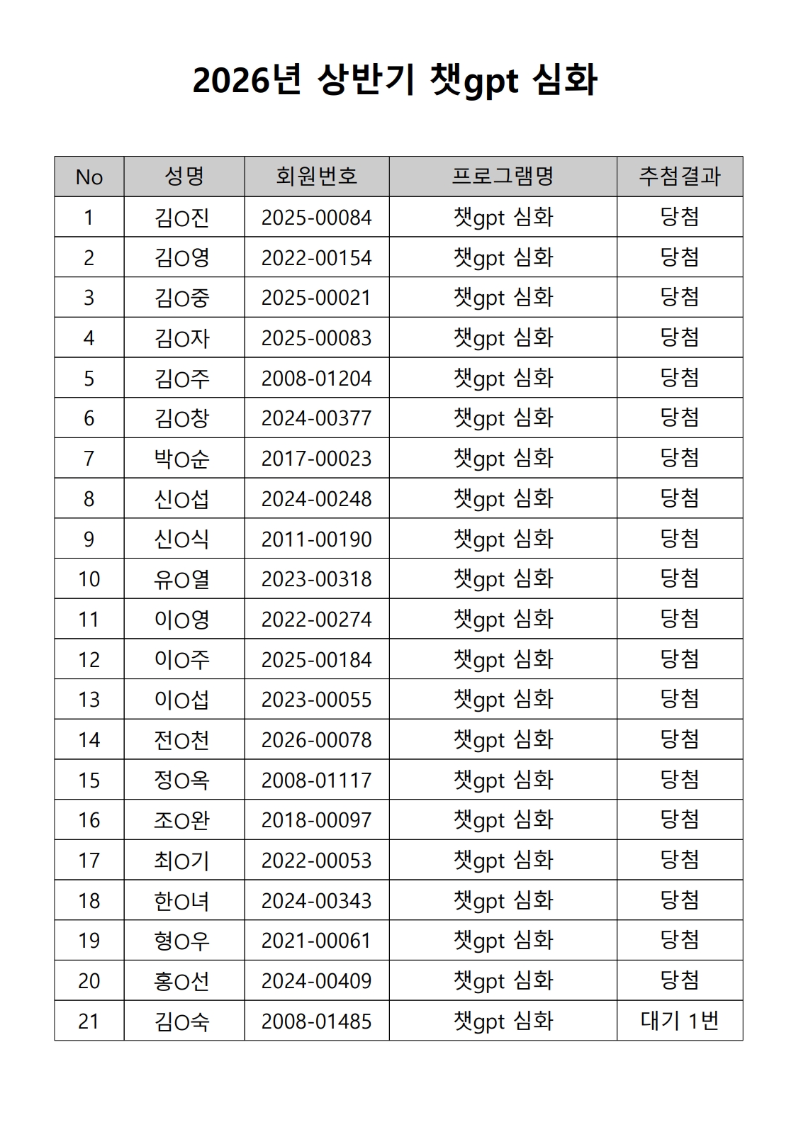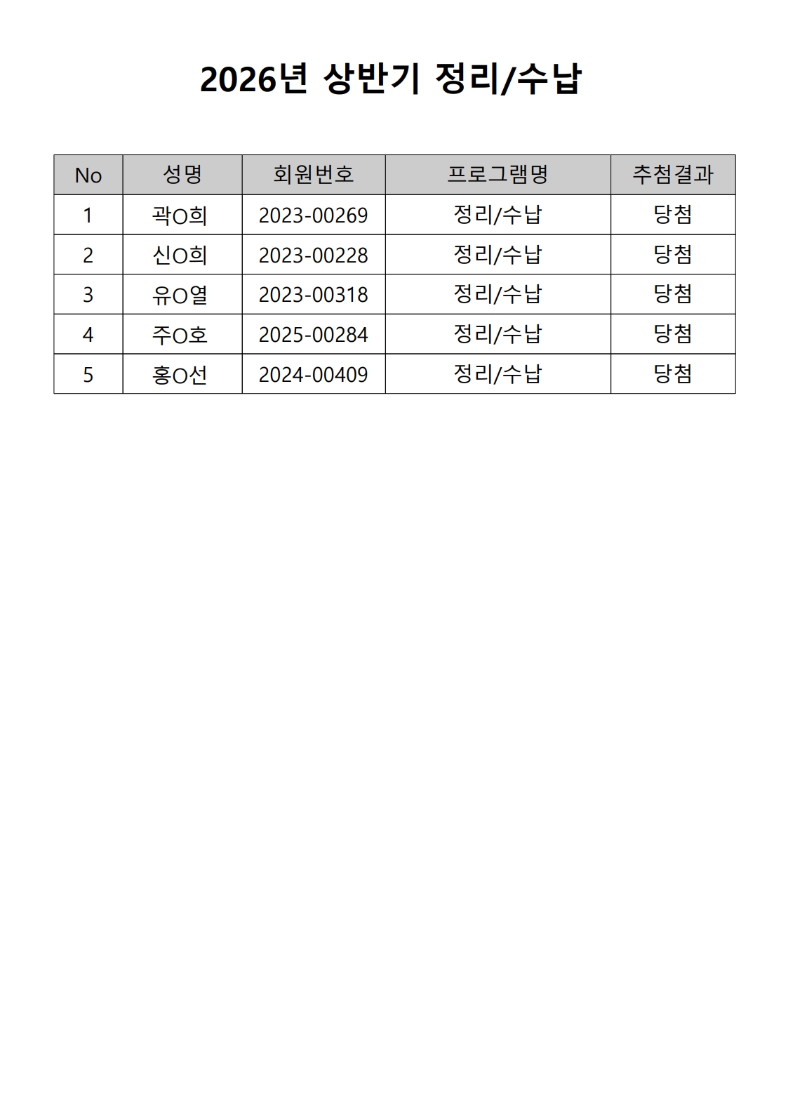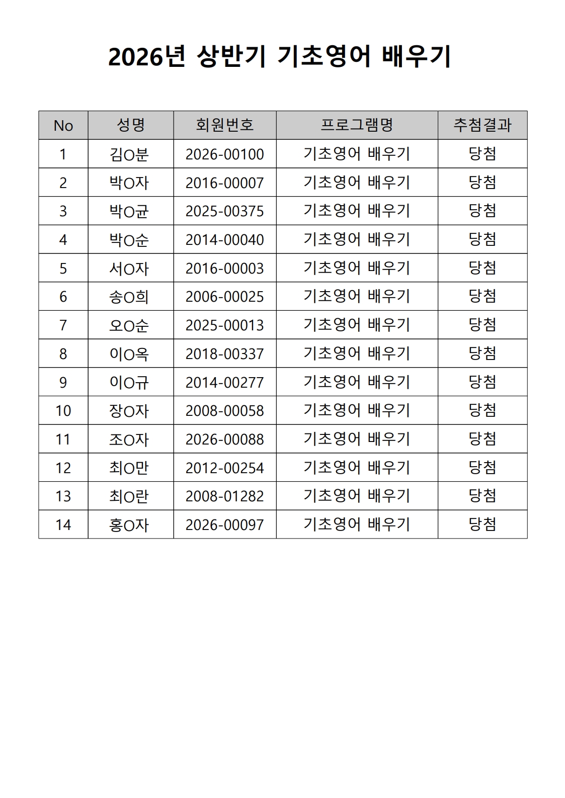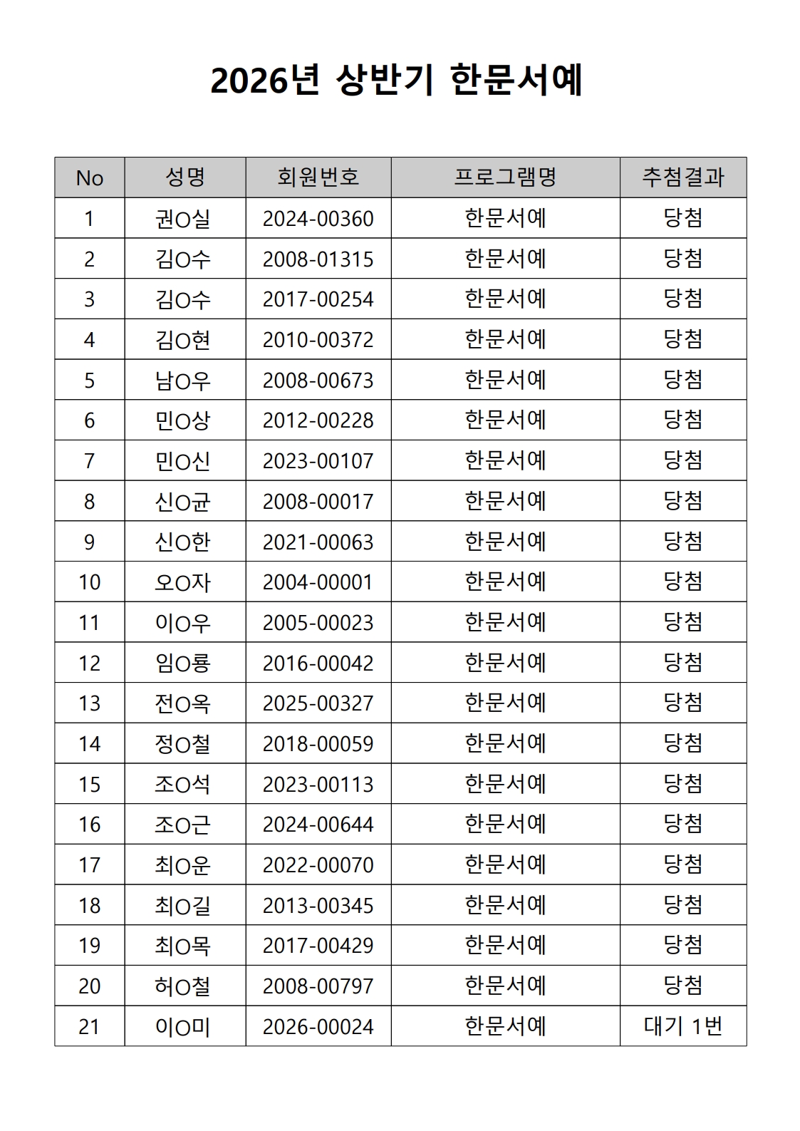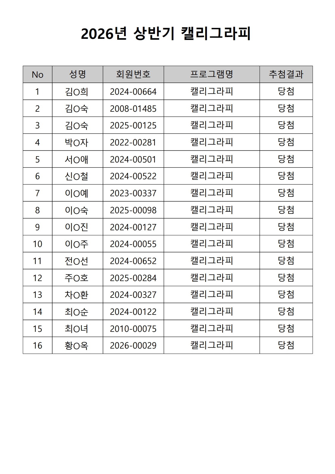 2026년 상반기 노년사회화 및 정보화교육프로그램 추첨이 2026.02.02.(월) 11:00에 진행되었으며, 이에 따라 아래와 같이 추첨 결과를 안내드립니다. (정원 초과 과목에 대한 추첨만 진행)