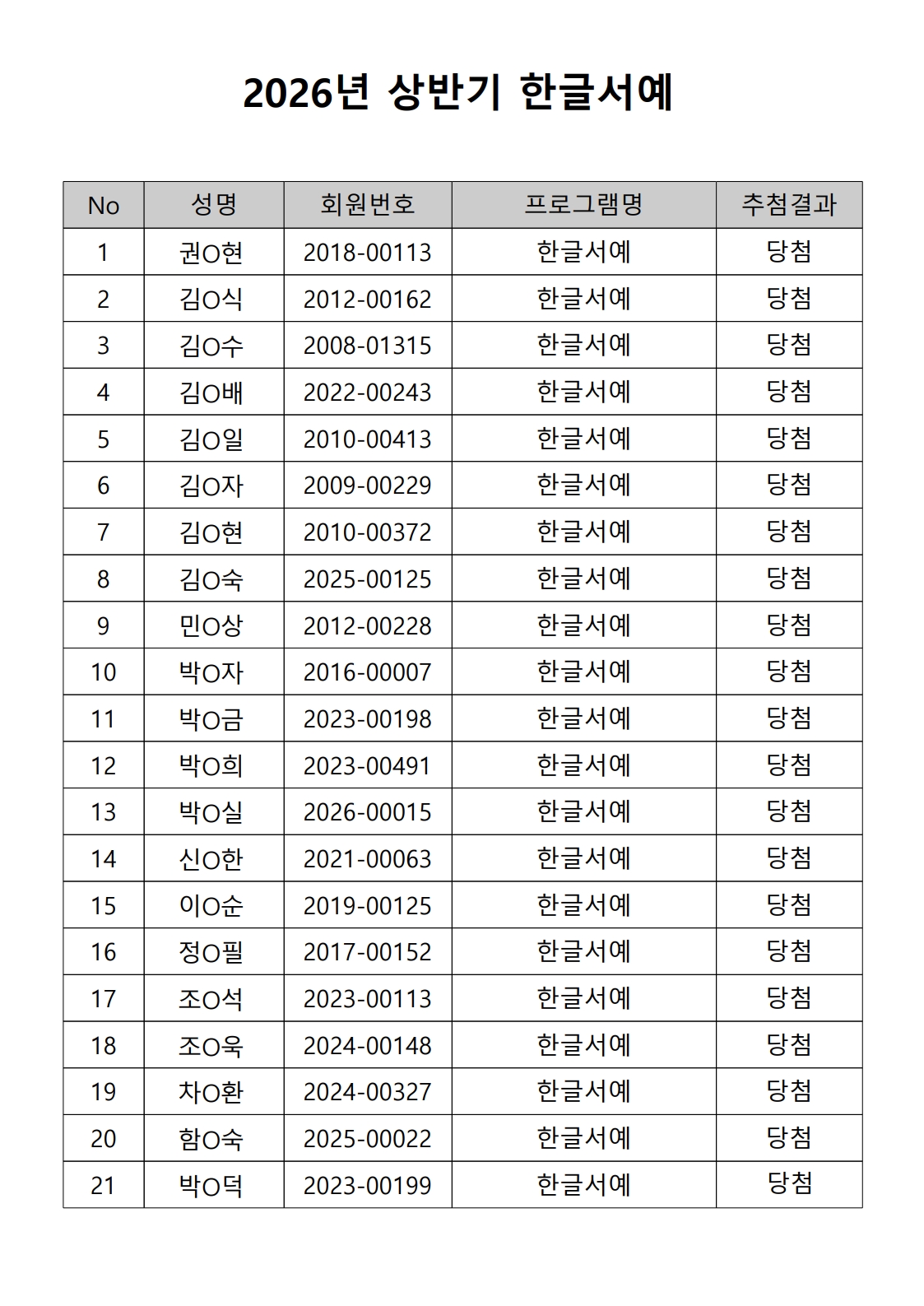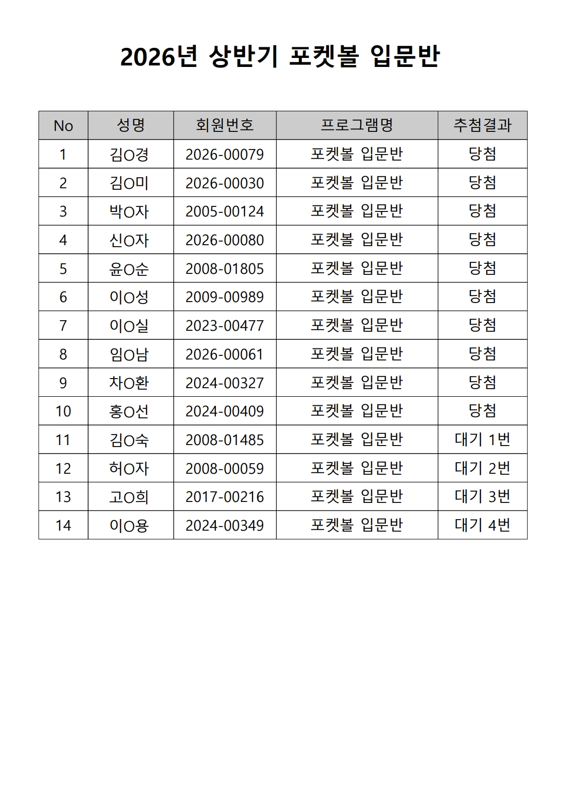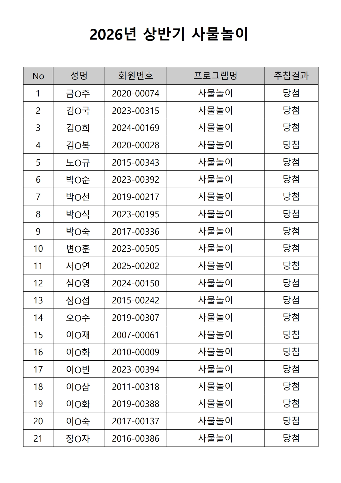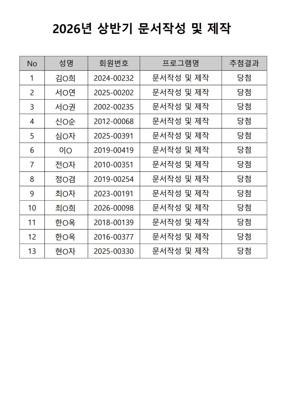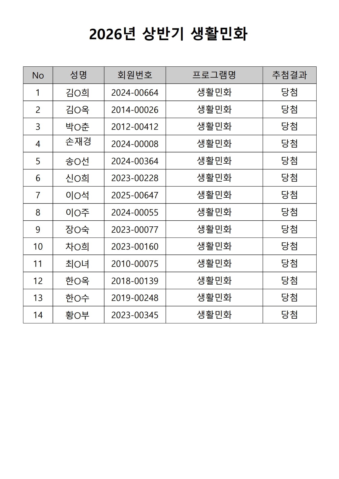 2026년 상반기 노년사회화 및 정보화교육프로그램 추첨이 2026.02.02.(월) 11:00에 진행되었으며, 이에 따라 아래와 같이 추첨 결과를 안내드립니다. (정원 초과 과목에 대한 추첨만 진행)