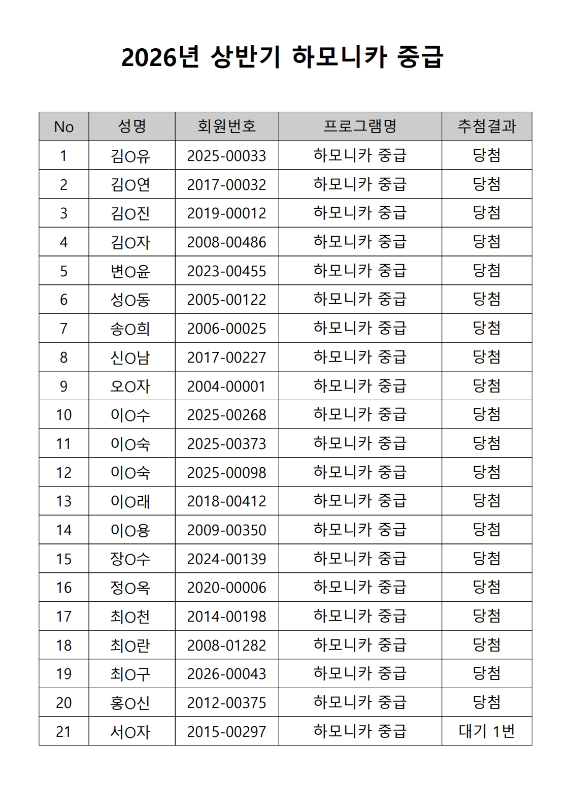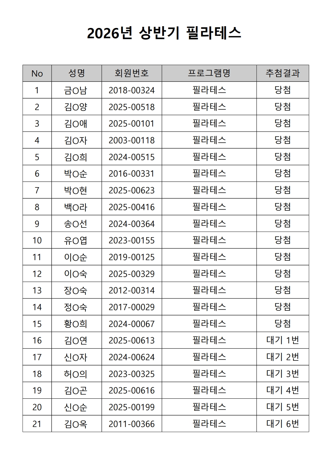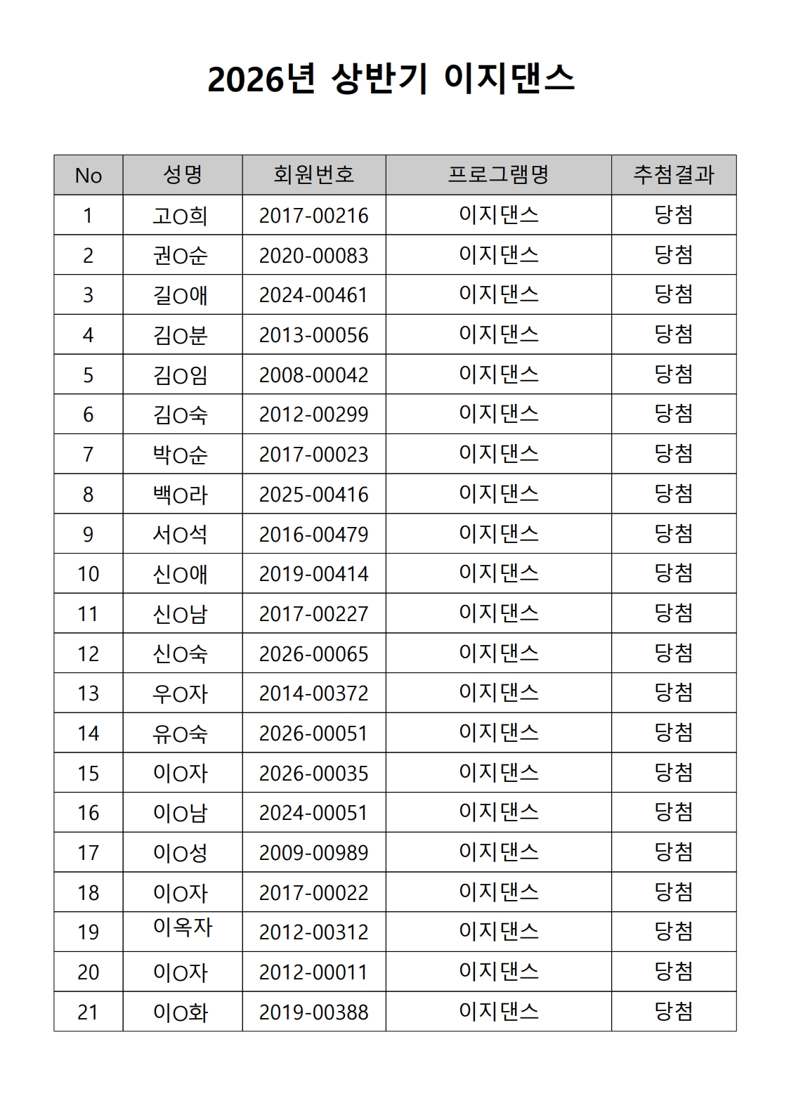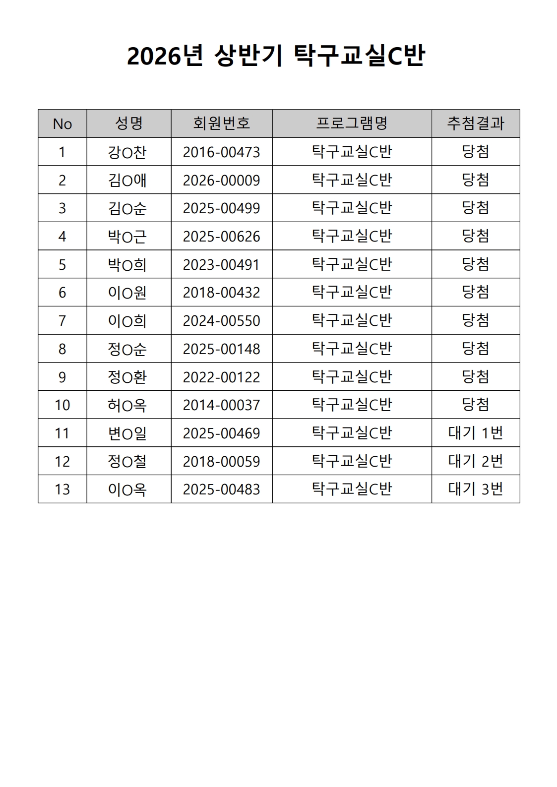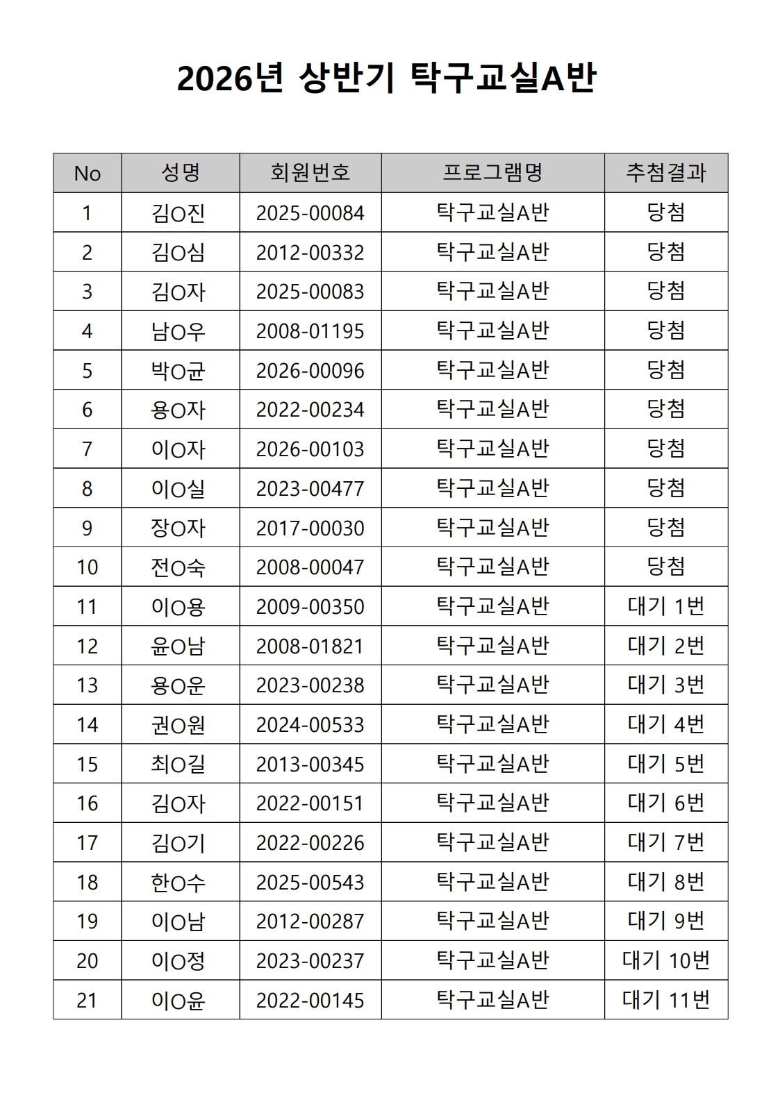 2026년 상반기 노년사회화 및 정보화교육프로그램 추첨이 2026.02.02.(월) 11:00에 진행되었으며, 이에 따라 아래와 같이 추첨 결과를 안내드립니다. (정원 초과 과목에 대한 추첨만 진행)