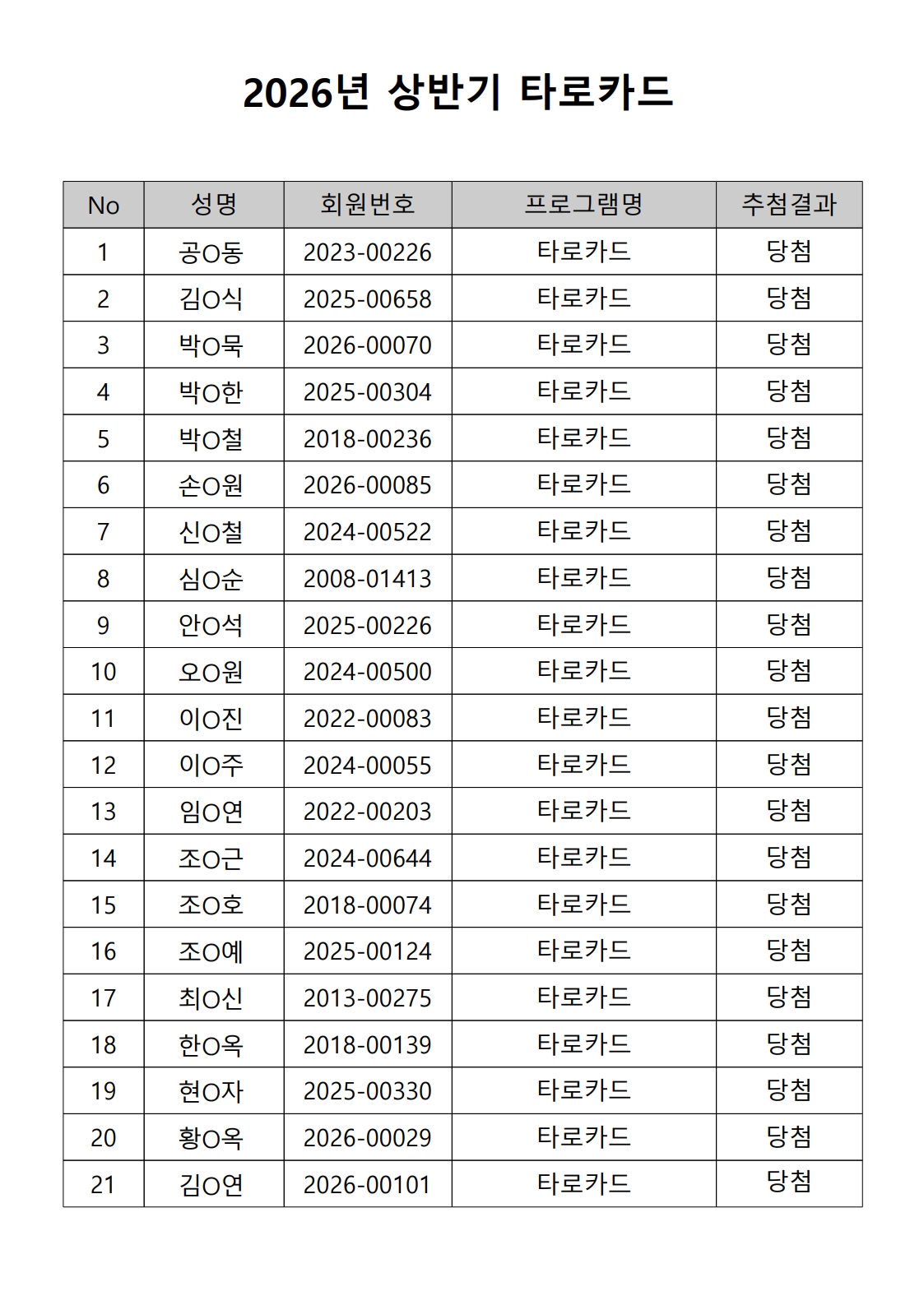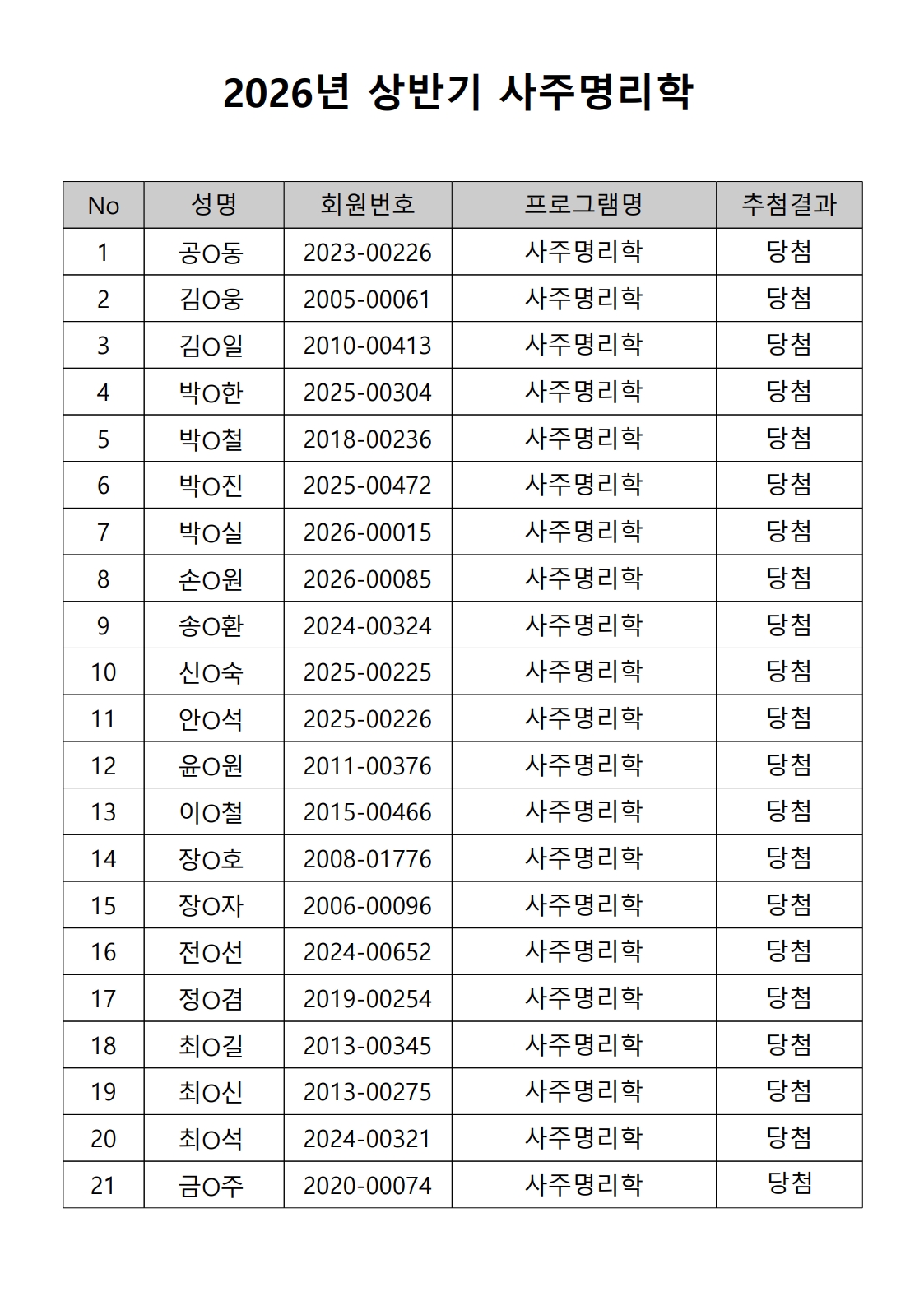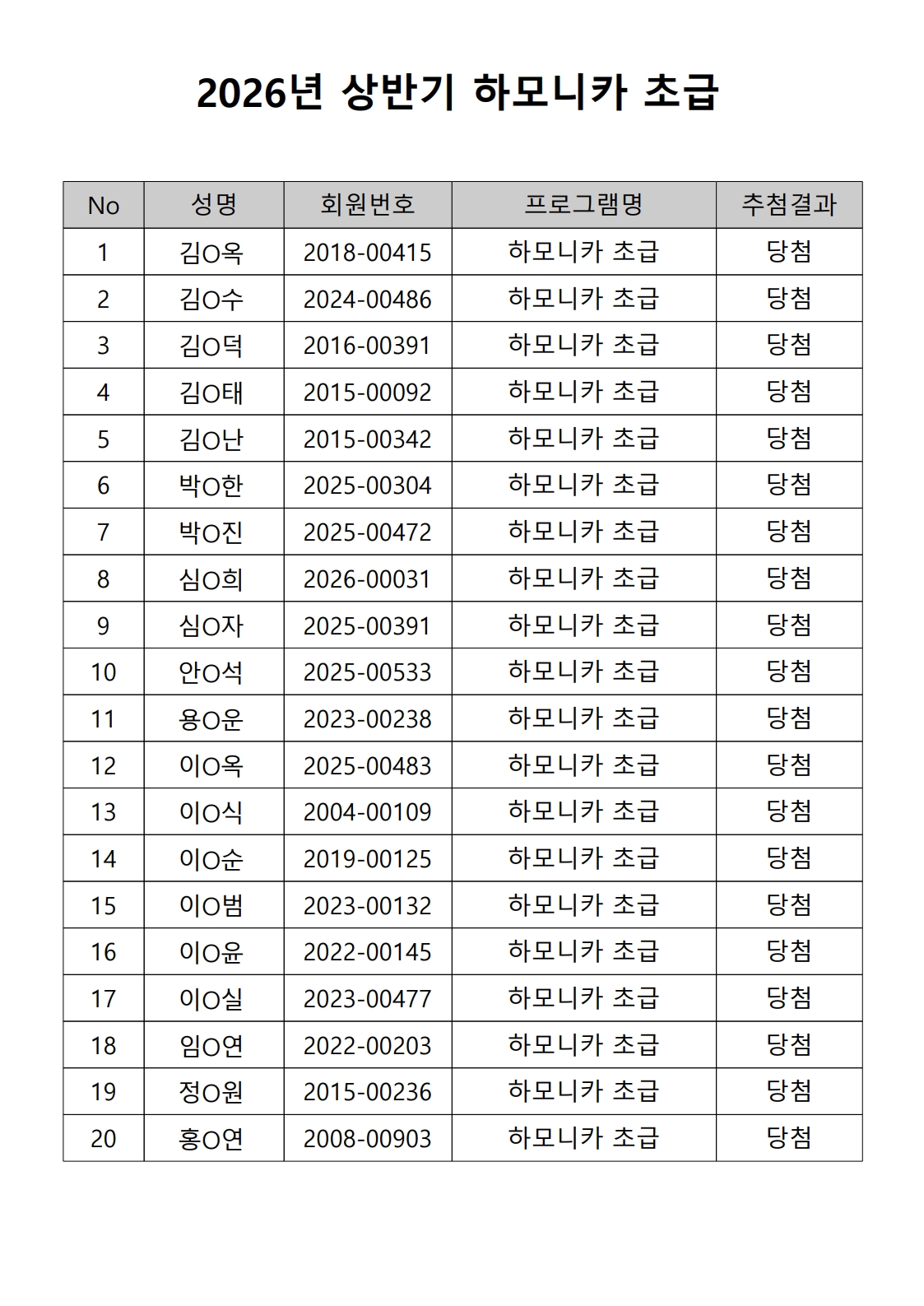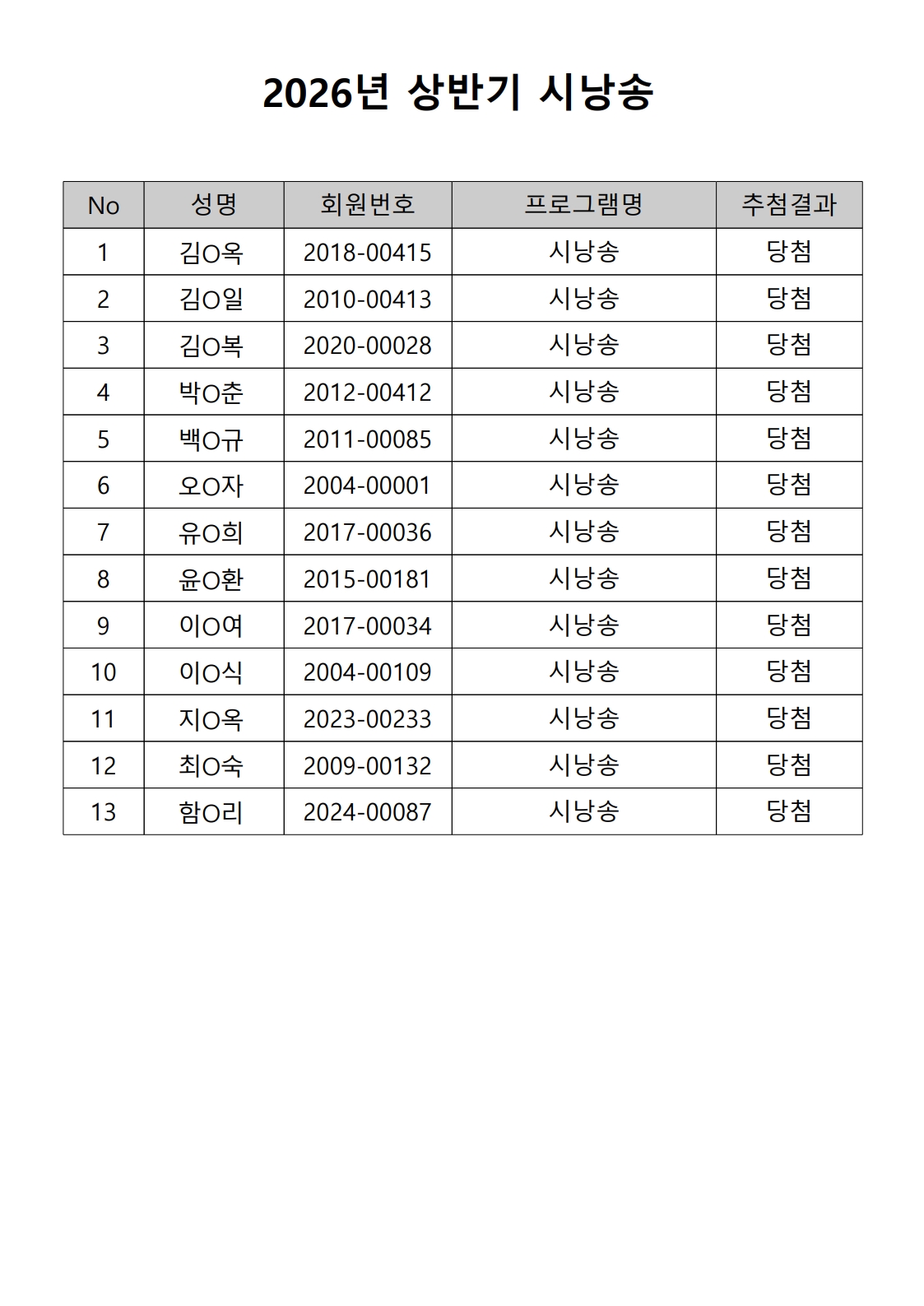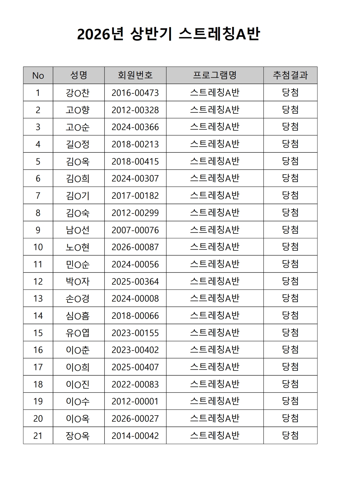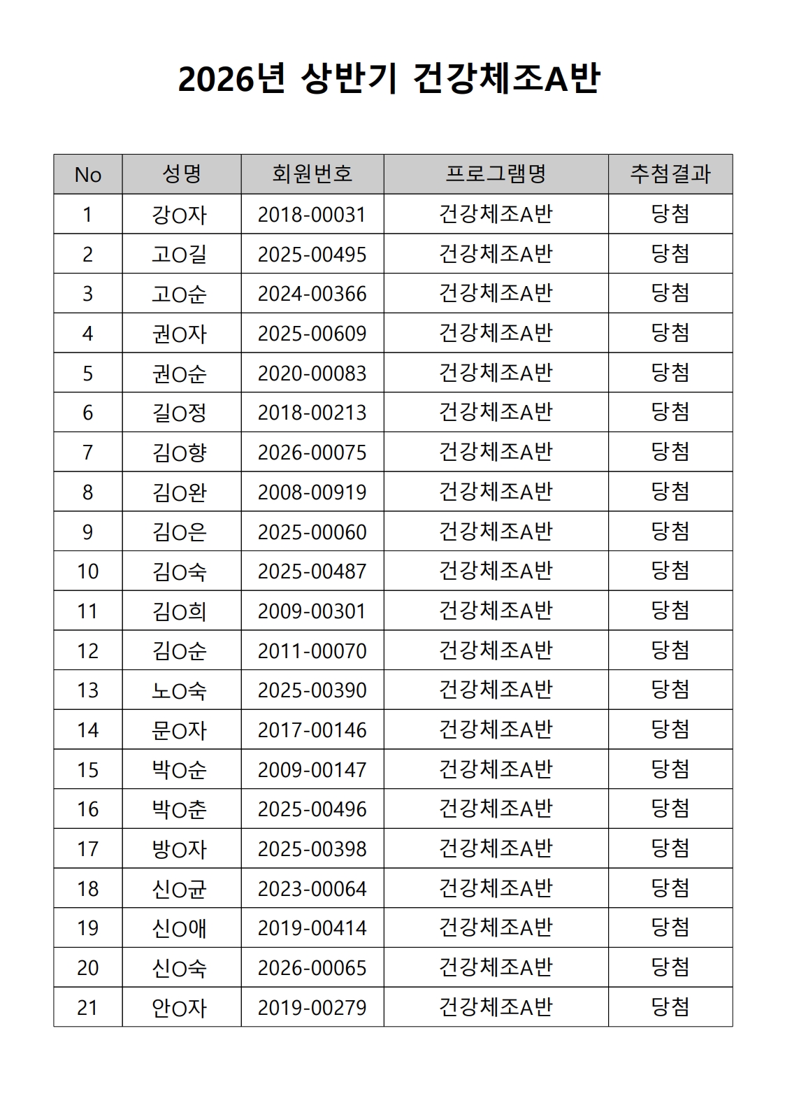 2026년 상반기 노년사회화 및 정보화교육프로그램 추첨이 2026.02.02.(월) 11:00에 진행되었으며, 이에 따라 아래와 같이 추첨 결과를 안내드립니다. (정원 초과 과목에 대한 추첨만 진행)