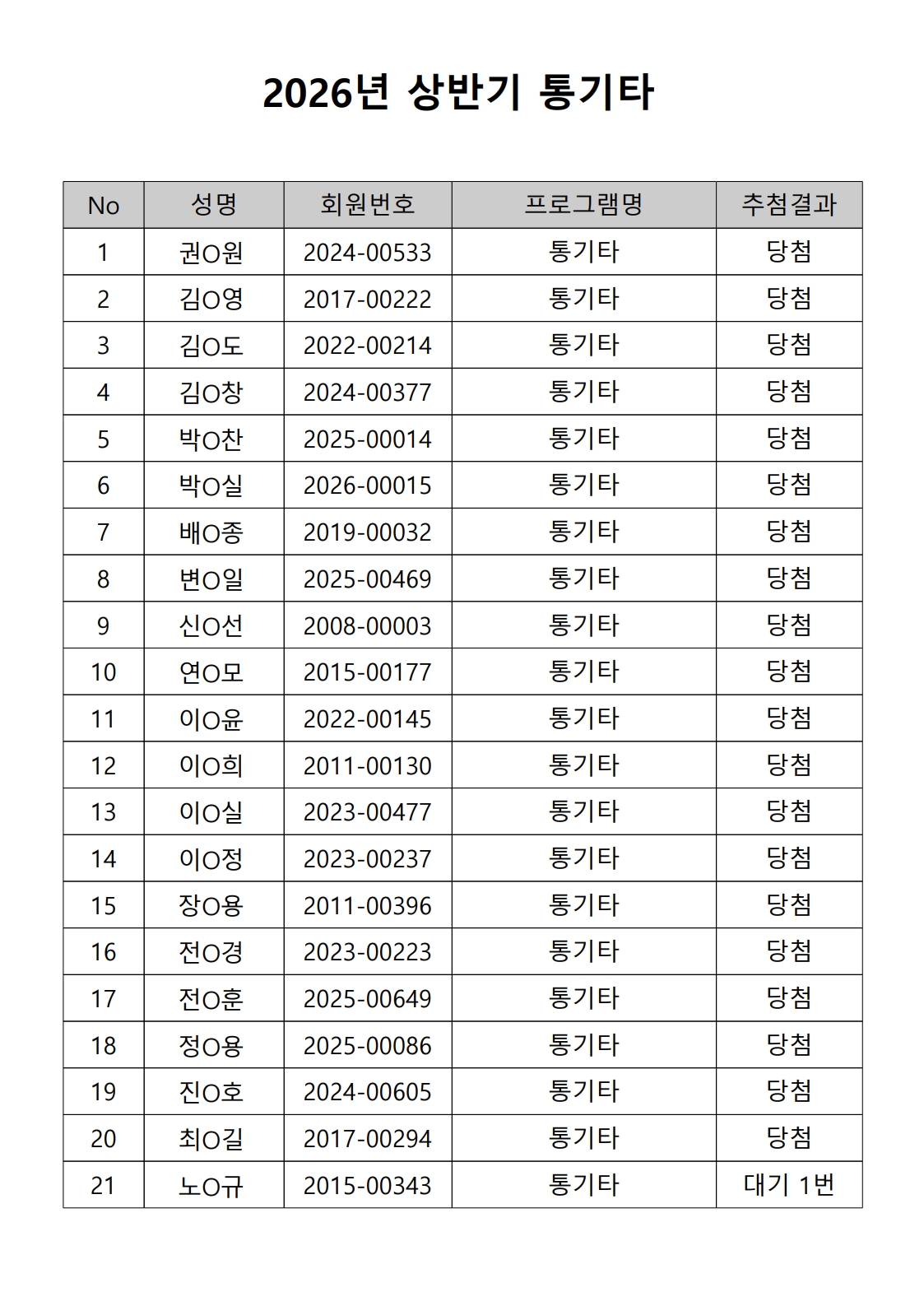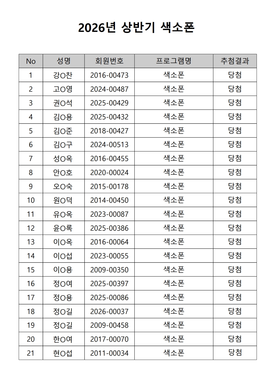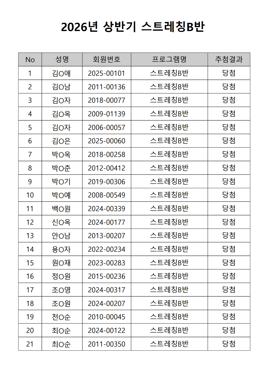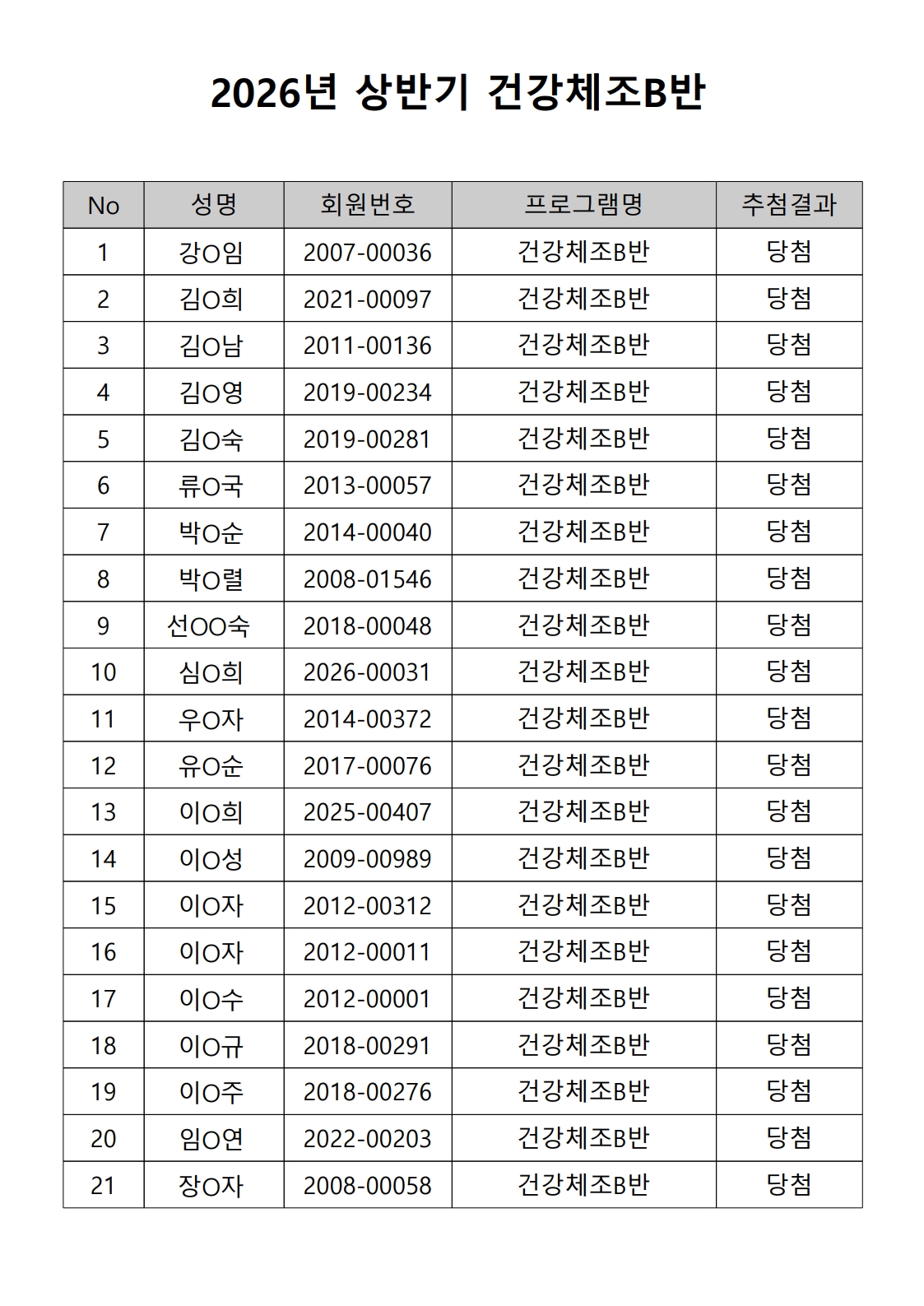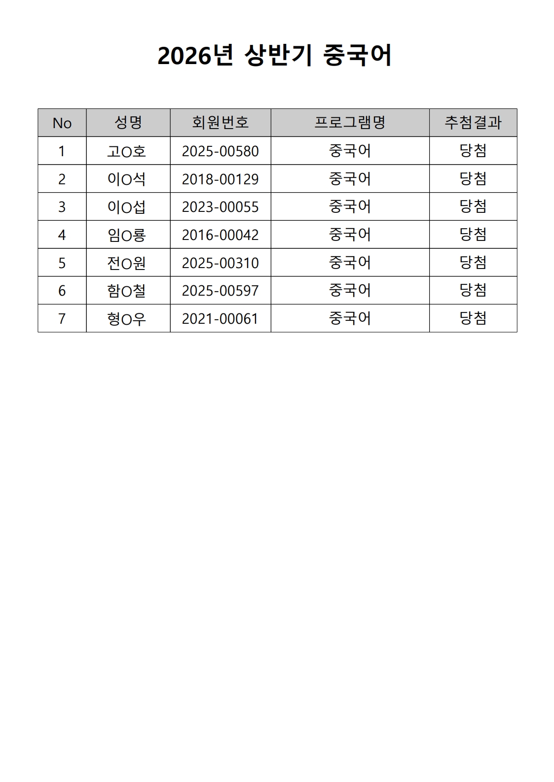 2026년 상반기 노년사회화 및 정보화교육프로그램 추첨이 2026.02.02.(월) 11:00에 진행되었으며, 이에 따라 아래와 같이 추첨 결과를 안내드립니다. (정원 초과 과목에 대한 추첨만 진행)