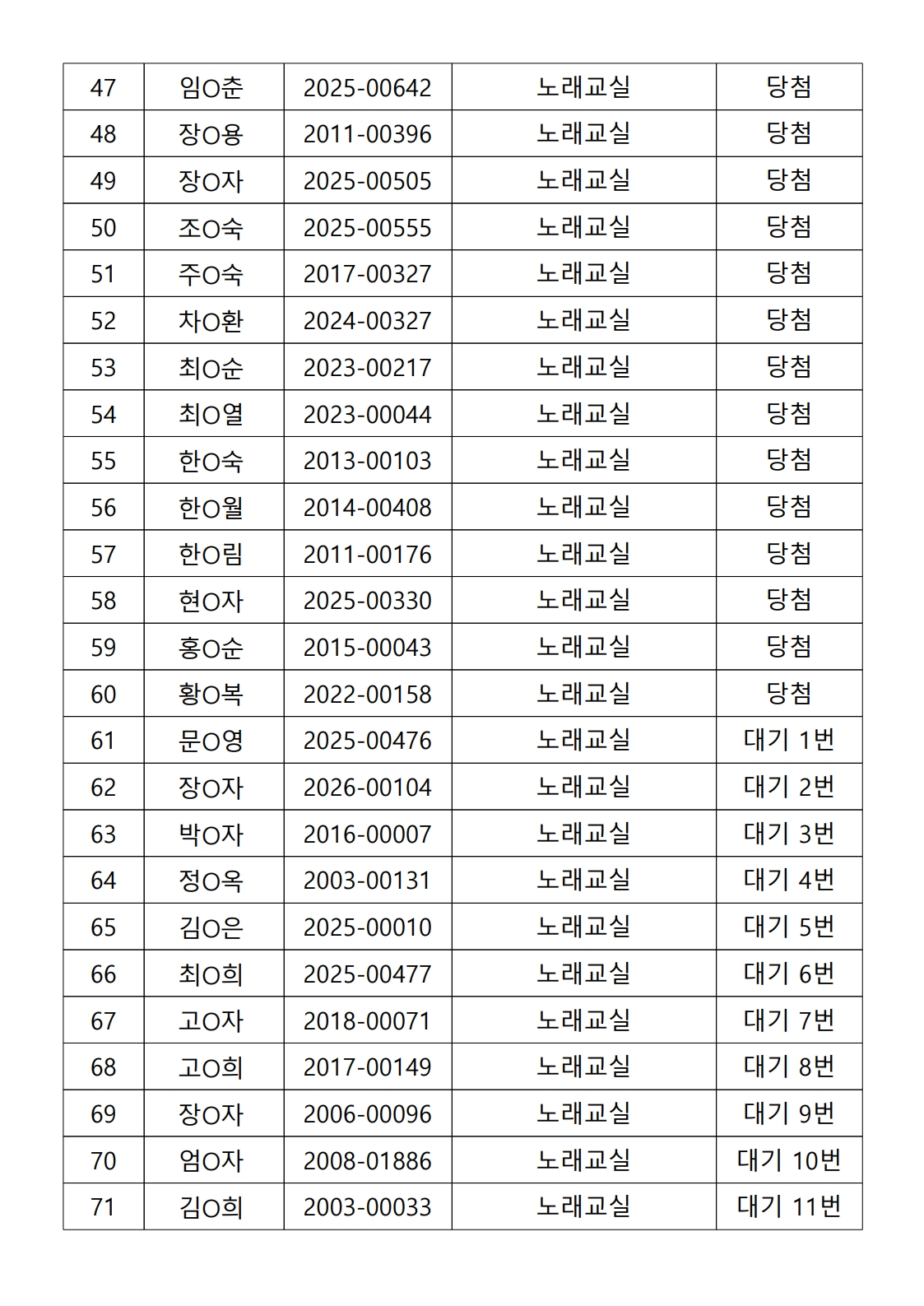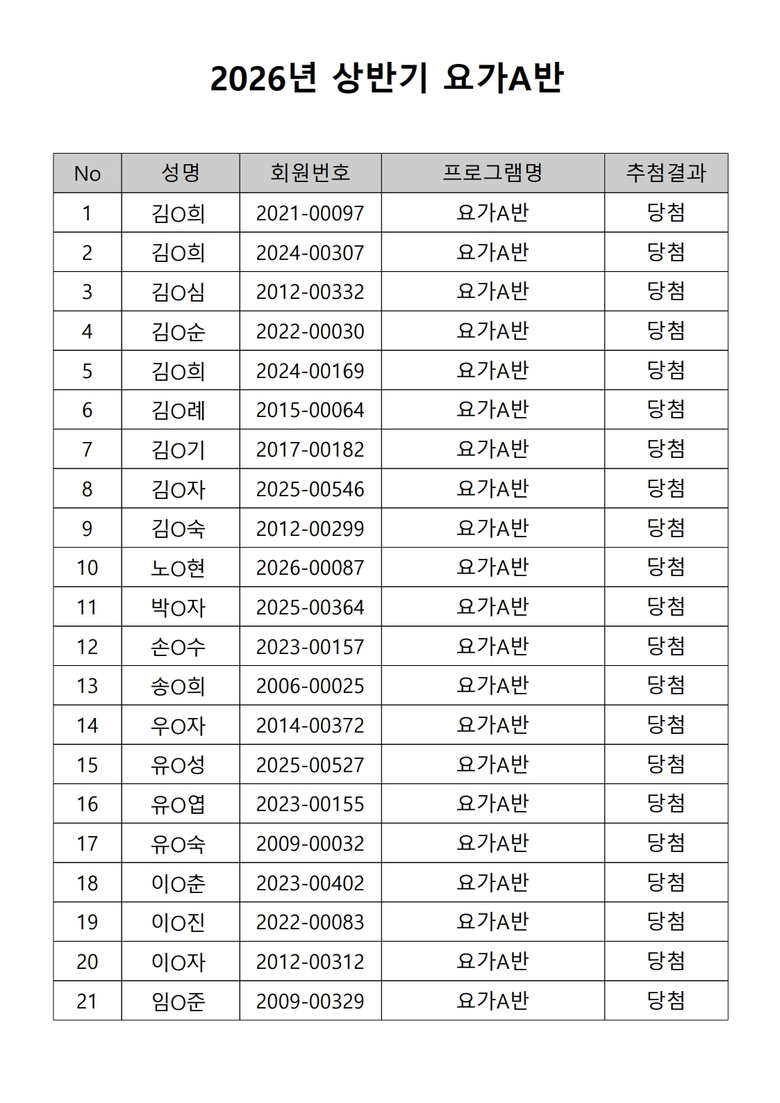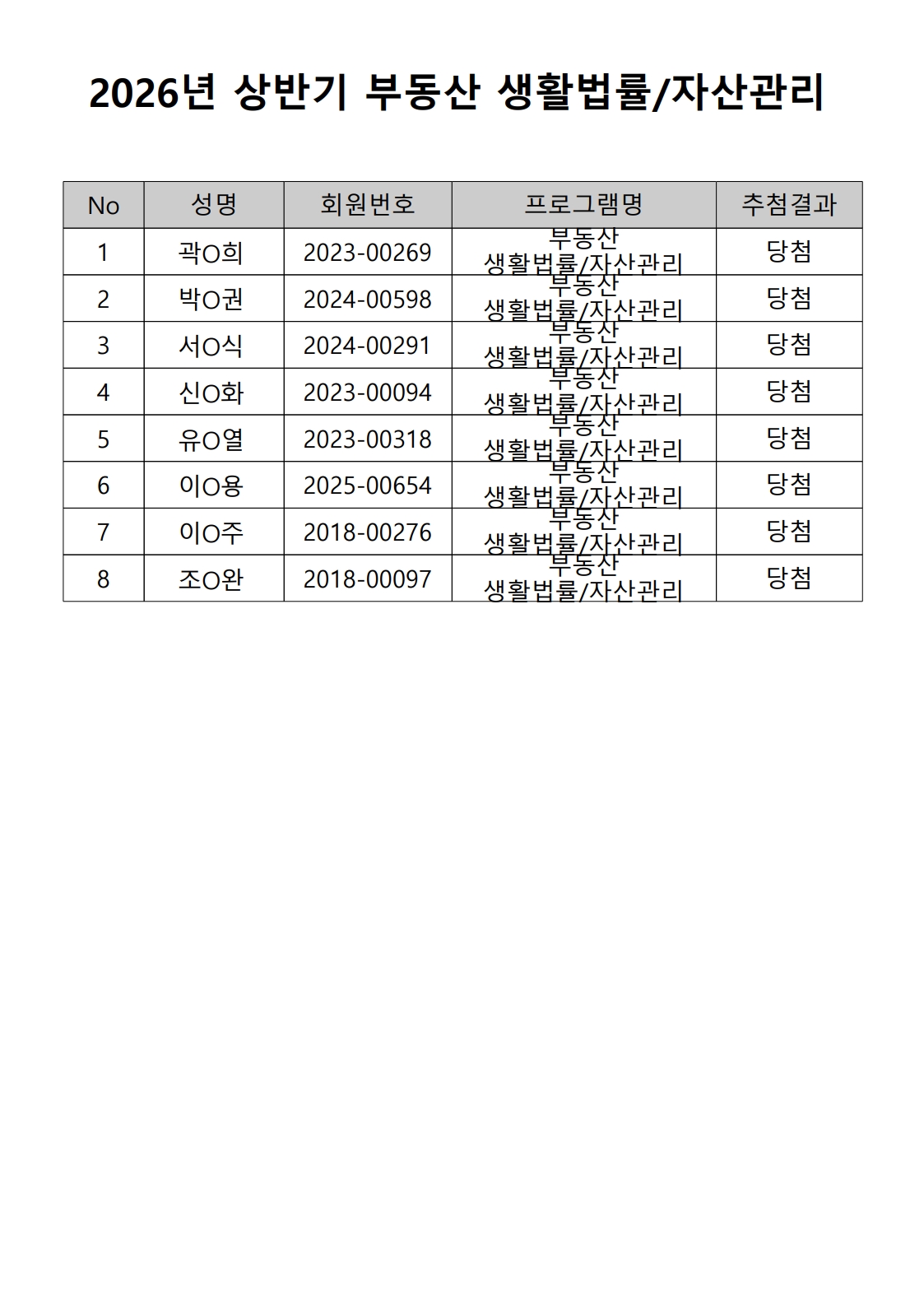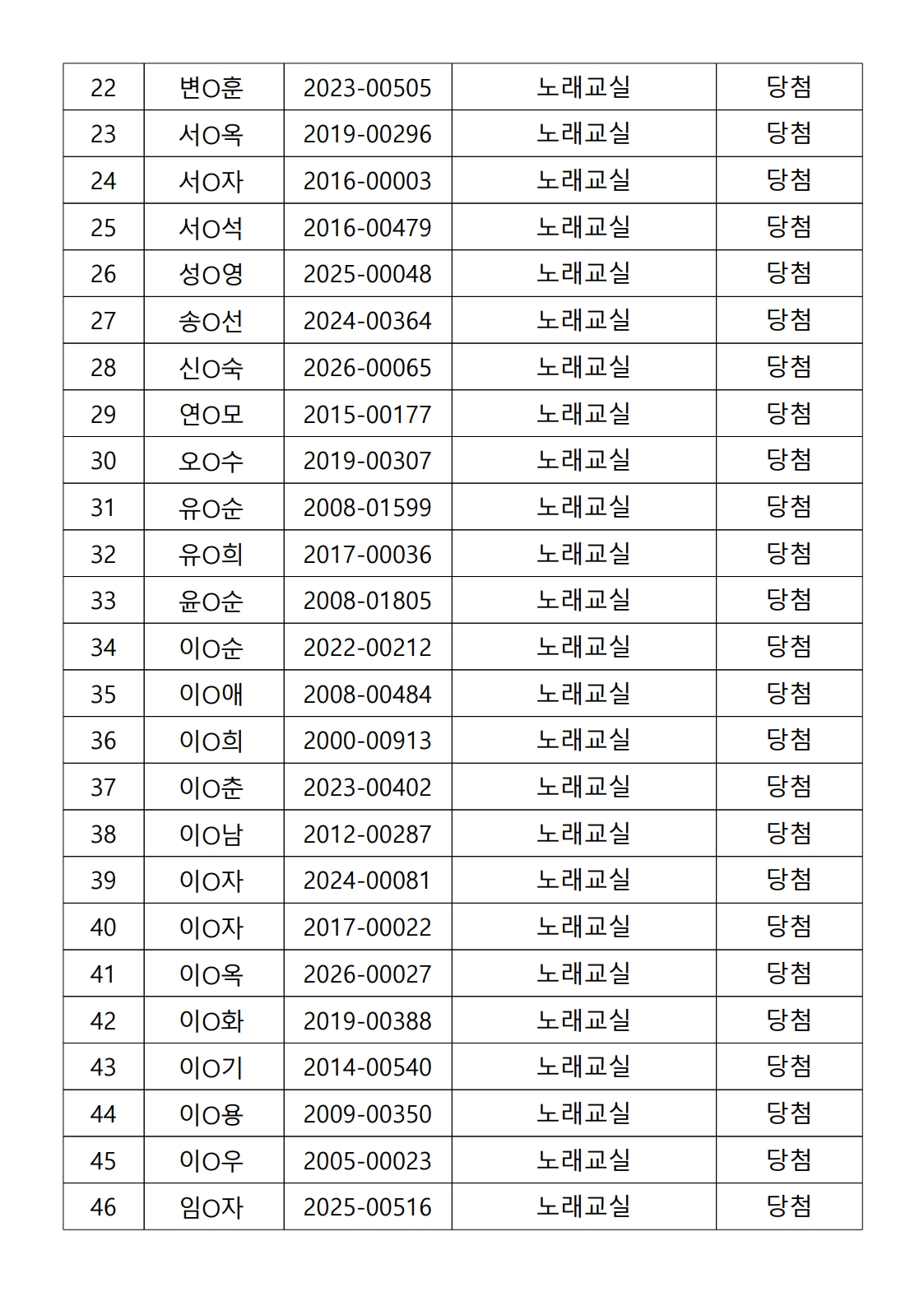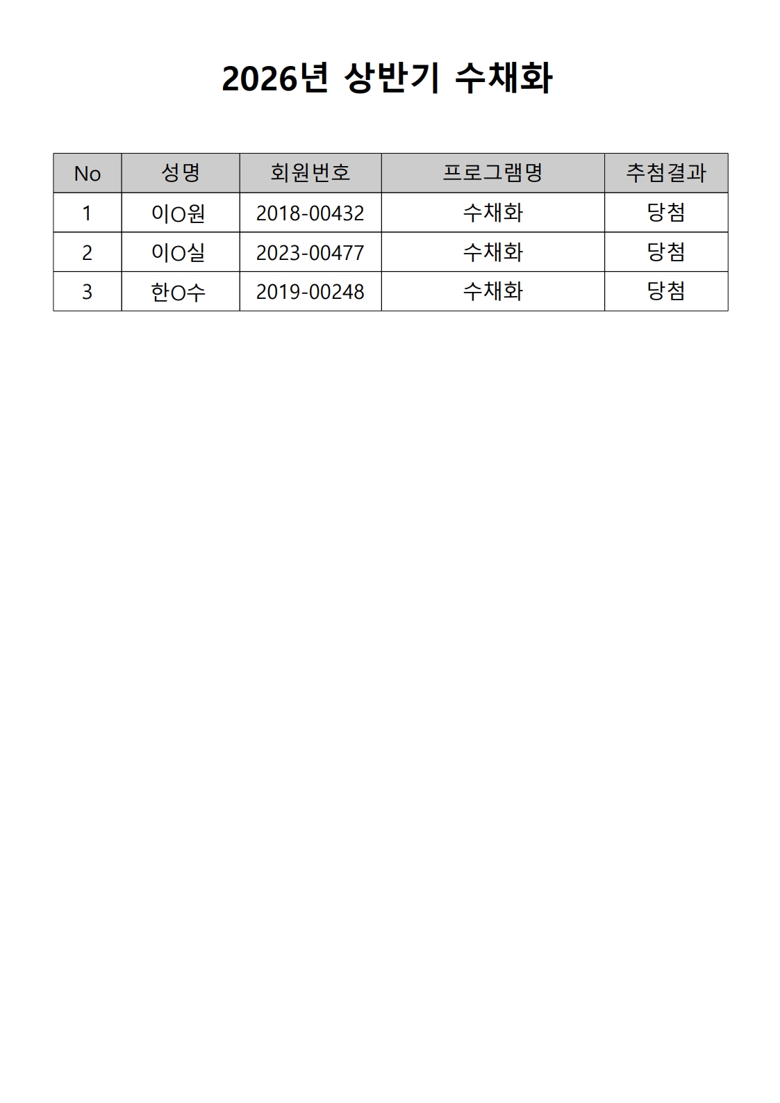 2026년 상반기 노년사회화 및 정보화교육프로그램 추첨이 2026.02.02.(월) 11:00에 진행되었으며, 이에 따라 아래와 같이 추첨 결과를 안내드립니다. (정원 초과 과목에 대한 추첨만 진행)