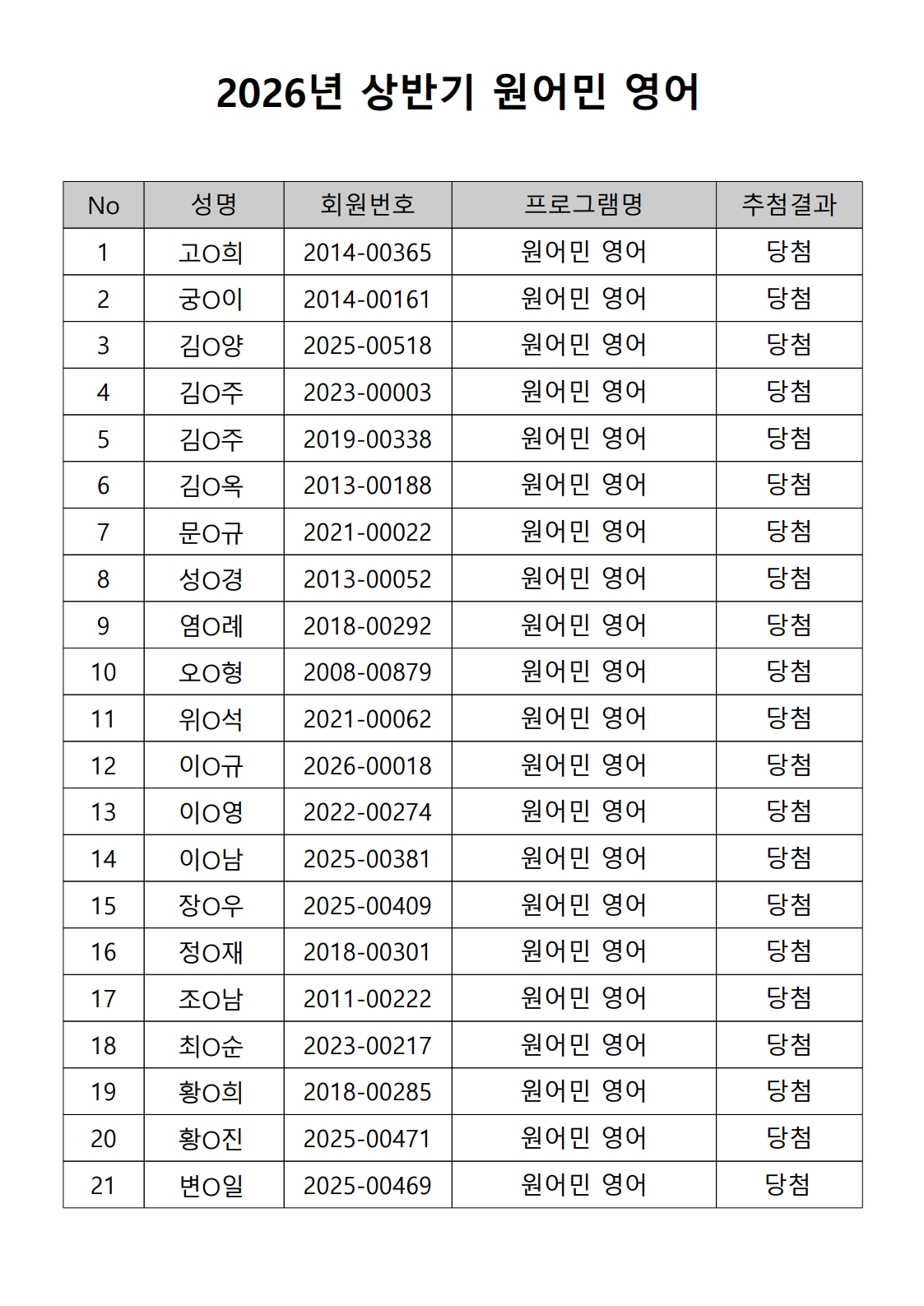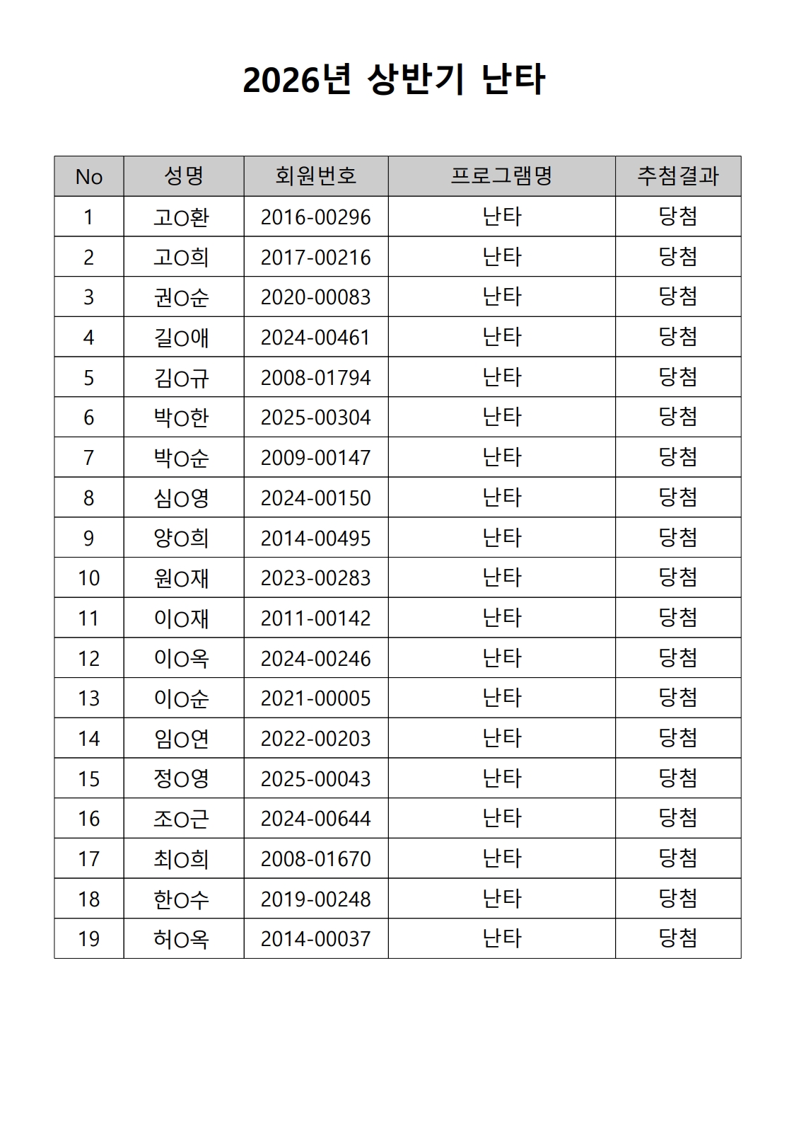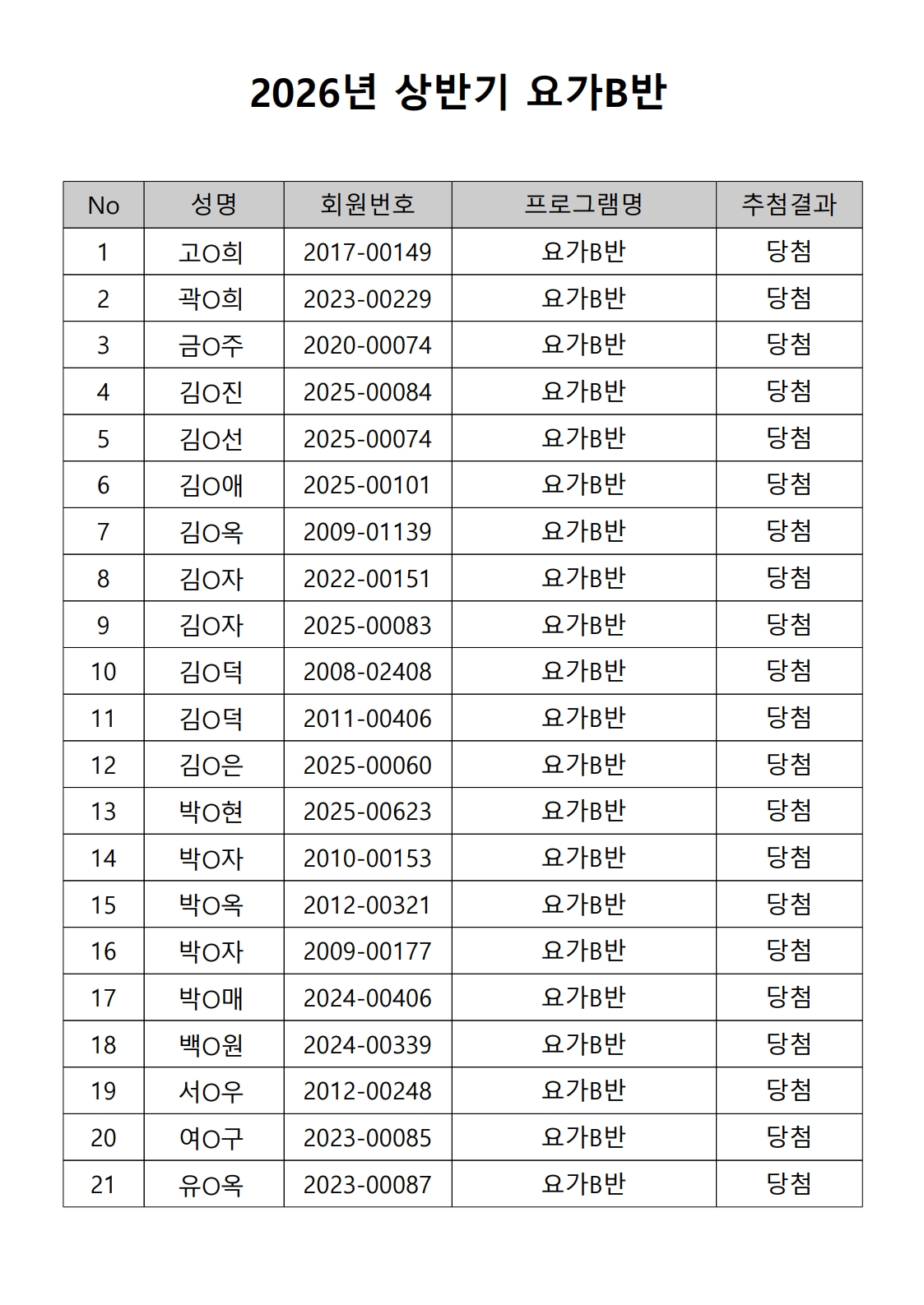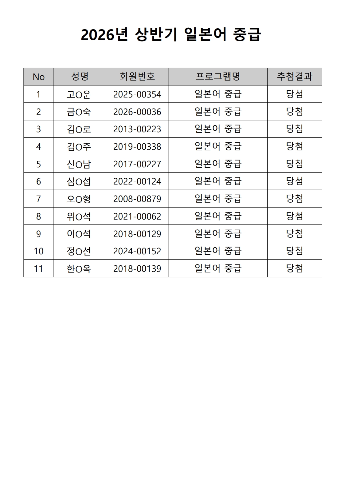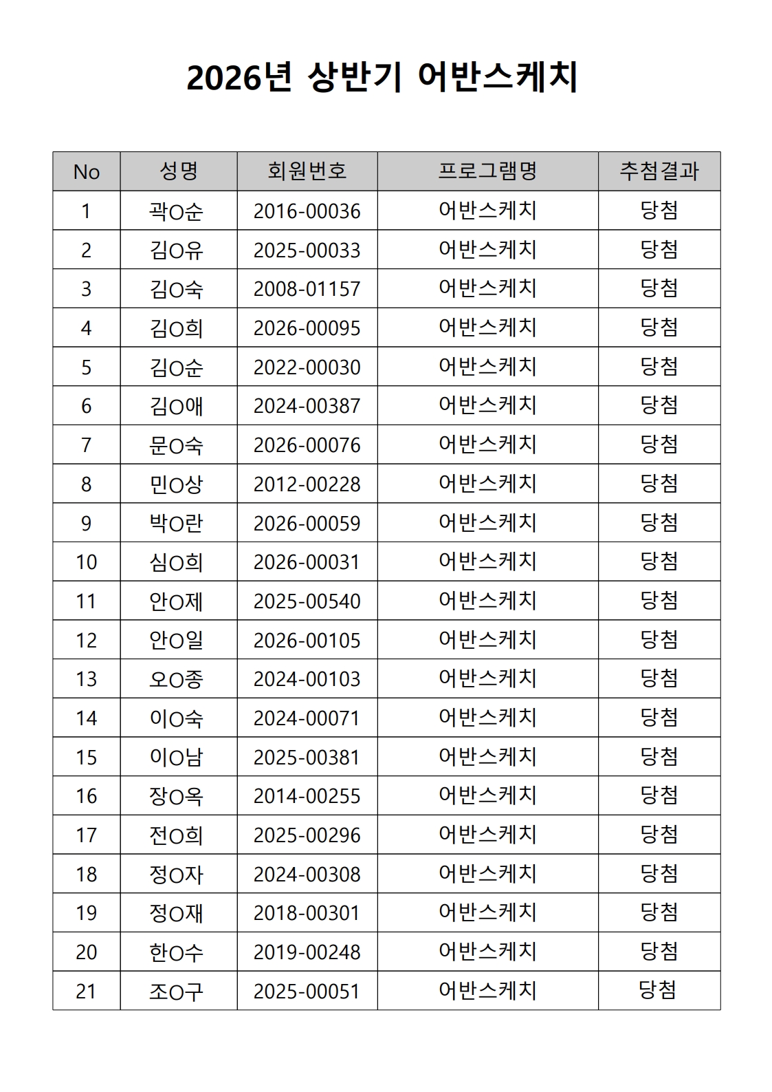2026년 상반기 노년사회화 및 정보화교육프로그램 추첨이 2026.02.02.(월) 11:00에 진행되었으며, 이에 따라 아래와 같이 추첨 결과를 안내드립니다. (정원 초과 과목에 대한 추첨만 진행)
