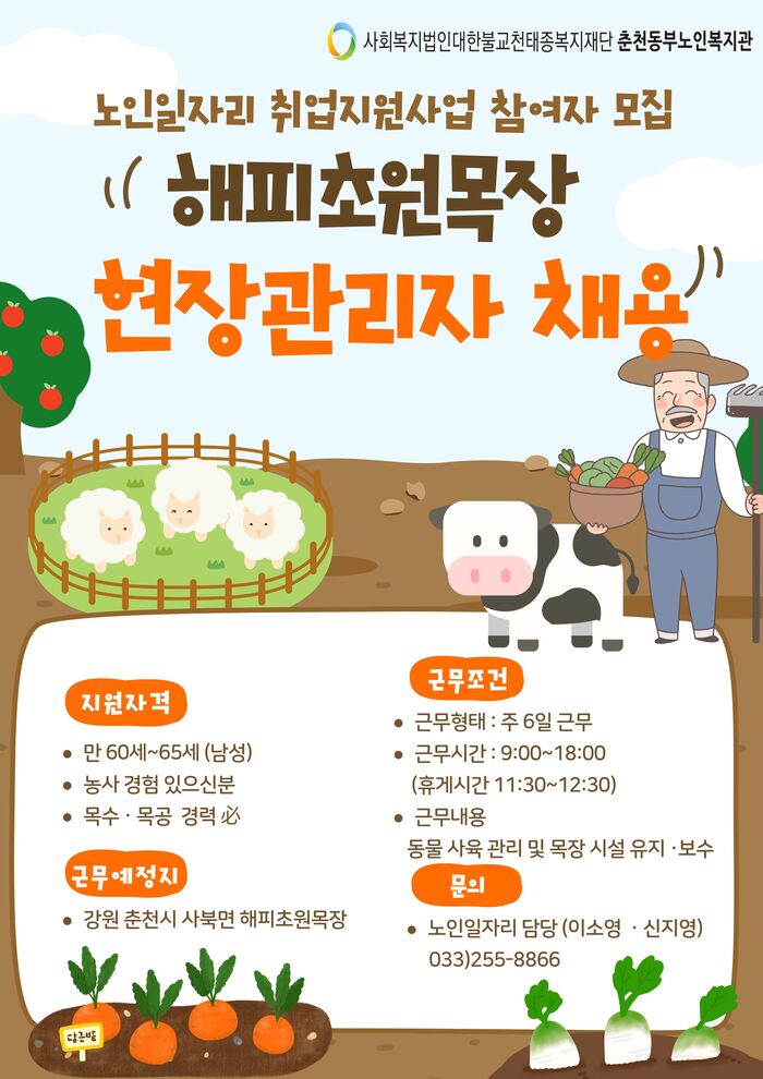 춘천동부노인복지관에서는 노인일자리 취업지원사업의 일환으로 해피초원목장 현장관리자를 모집합니다.