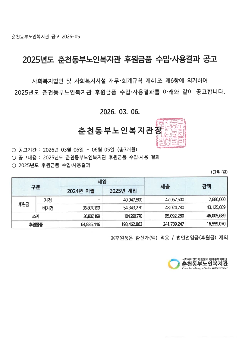 [후원금품 결산공고] "춘천동부노인복지관 공고 2026-05" 2025년도 후원금품 수입·사용 결산 공고