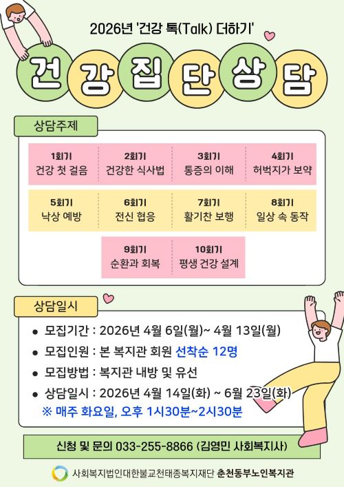 춘천동부노인복지관에서는 2026년 '건강 톡(Talk) 더하기' 건강집단상담 진행을 위해 참여자를 모집하오니 어르신들의 많은 관심과 참여 바랍니다.