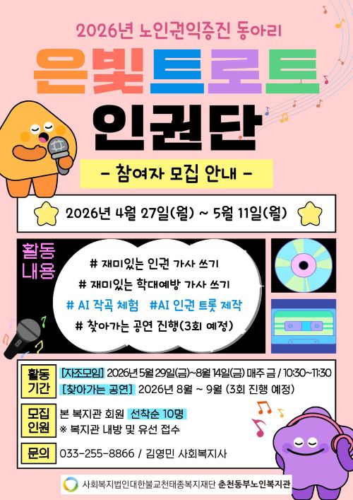 춘천동부노인복지관에서는 노인 인권 및 노인학대 예방에 대한 인식 제고를 위한 '은빛 트로트 인권단' 동아리를 운영하고자 하오니 많은 관심과 참여 바랍니다.