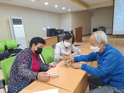 ○ 내 용 : 치매 예방프로그램 6회기에서는 돈치기놀이와 종이접기를 활용한 숫자게임을 통하여 두뇌활동과 신체 활동을 하였습니다. 젠가를 이용하여 집중력을 향상하고 해피테이블로 퀴즈놀이를 하면서 인지기능에 도움이 되고자 하였습니다.