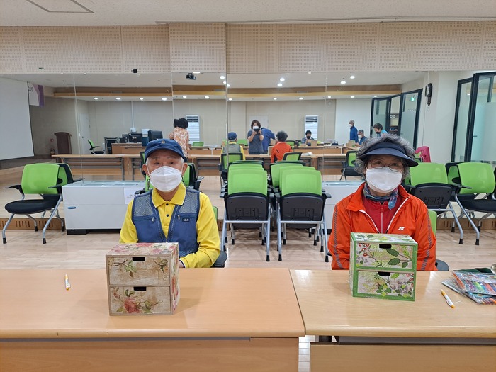 ○ 내 용 : 치매 예방프로그램 7회기에서는 냅킨을 활용한 냅킨아트로 미니서랍장를 만드는 시간을 가졌습니다. 냅킨을 오리고 붙이고 무늬를 맞추면서 집중력을 향상하고 소근육을 사용하여 두뇌를 자극함으로써 뇌활성화를 돕고자 하였습니다. 해피테이블은 업그레이드를 통하여 개별로그인을 하여 각자의 활용도를 데이터로 확인할 수 있게되었습니다.