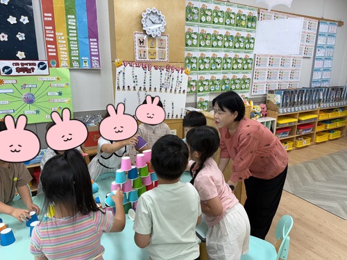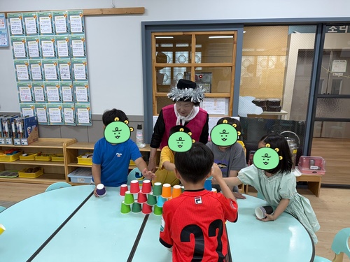 아이들은 세 모둠을 이루어 컵 쌓기 놀이를 하며 협동심을 발휘했고, 서로를 응원하며 즐겁게 참여했습니다.